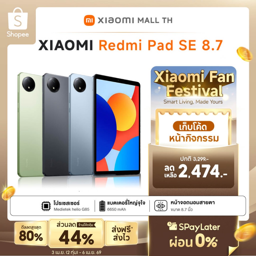 Xiaomi Redmi Pad SE 8.7 สเปค 4GB+64GB/ 6GB+128GB ขนาดหน้าจอ 8.7 นิ้ว ชิปเซ็ต MediaTek Helio G85 ความจุแบตเตอรี่ 6650mAh