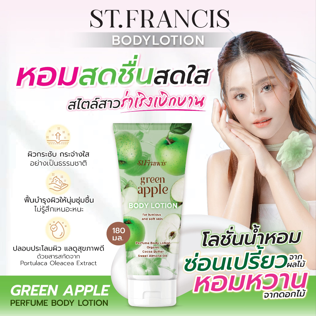 ST.FRANCIS โลชั่นน้ำหอม กลิ่น Green Apple 180ml. หอมละมุน ซึมซาบเร็ว เติมเต็มความชุ่มชื้น พร้อมดูแลผิวให้เนียนนุ่ม