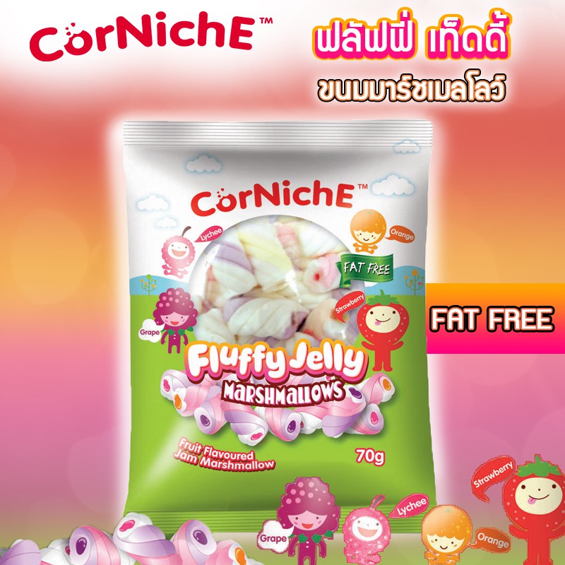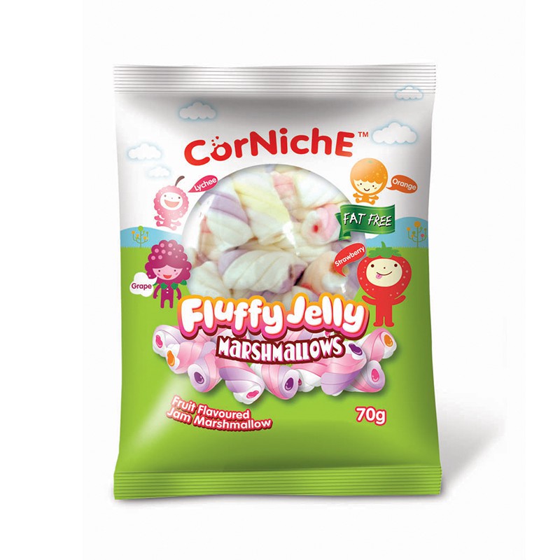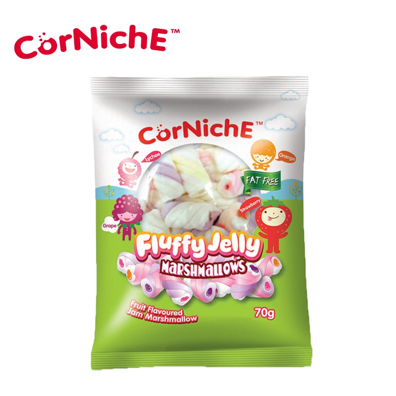 CORNICHE FLUFFY JELLY MARSHMALLOWS (ขนมมาร์ชเเมลโลว์สอดไส้แยมกลิ่นผลไม้) ขนาด 70 กรัม