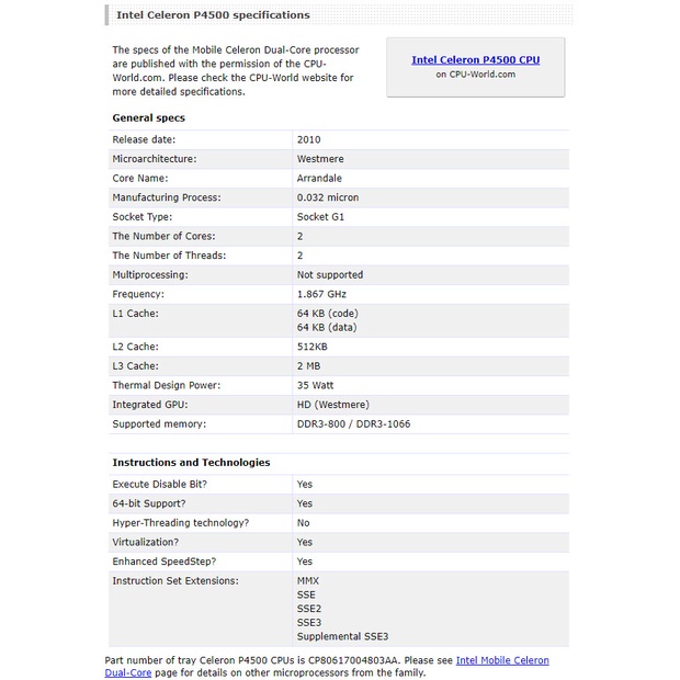 CPU NOTEBOOK Intel Celeron P4500 2Cores/ 2Threads @1.867GHz L3 Cache2MB Socket G1/RPGA988A