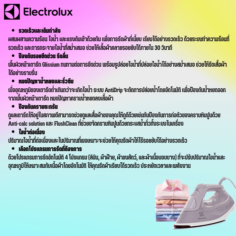 เตารีดไอน้ำ ELECTROLUX รุ่น E6SI3-61SL กำลัง 2,400 วัตต์ สีสี Soft Lavender