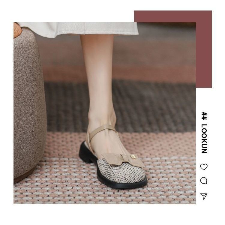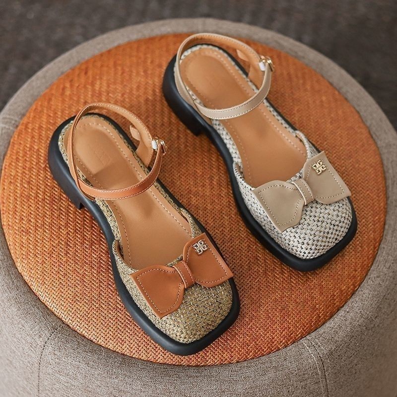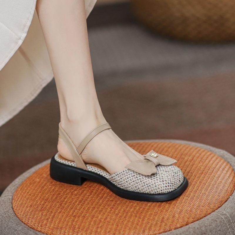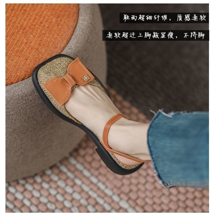 [คลังสินค้าพร้อม] รองเท้าแตะคลุมนิ้วเท้าทอย้อนยุคผู้หญิงรองเท้าโรมันแบนแฟชั่นส้นหนาโบว์สไตล์นางฟ้า、复古编织包头凉鞋女式平底罗马鞋时尚粗跟仙女风蝴蝶结