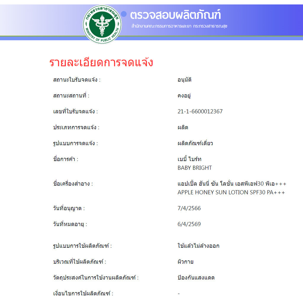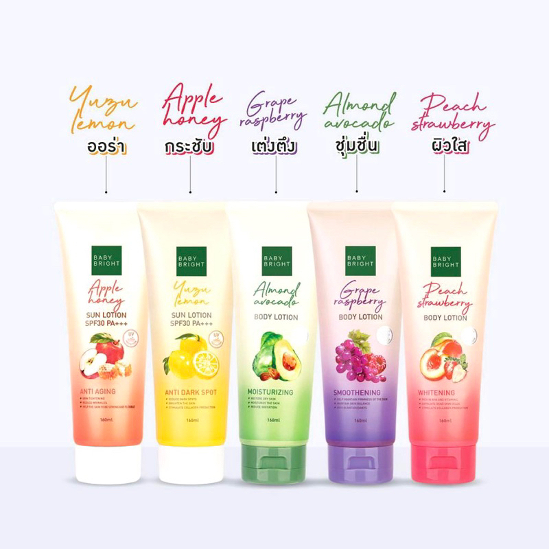 เบบี้ไบร์ท โลชั่นทาผิว กันแดด สูตร ผลไม้ Baby Bright Sun Lotion SPF30 PA+++ 160 ml. 5 สูตร Almond Peach Yuzu Apple Grape