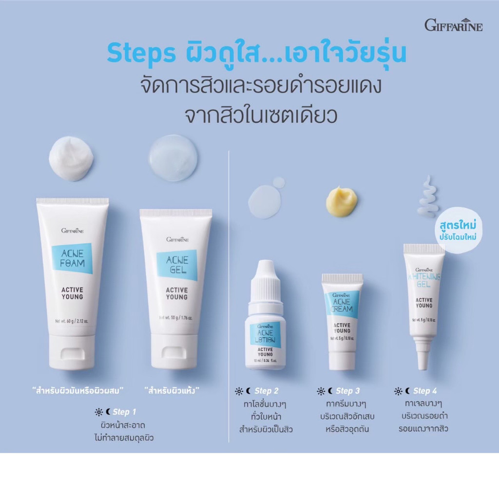 แอคเน่ กิฟฟารีน โฟมล้างหน้า เจลล้างหน้า ครีมแต้มสิว แอคทีฟ ยัง กิฟฟารีน Giffarine Whitening Gel Active Young