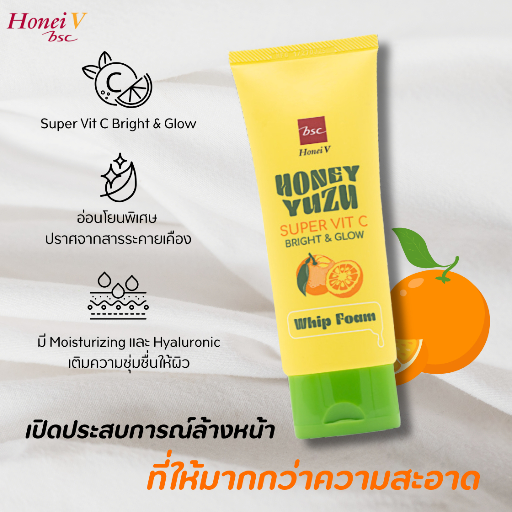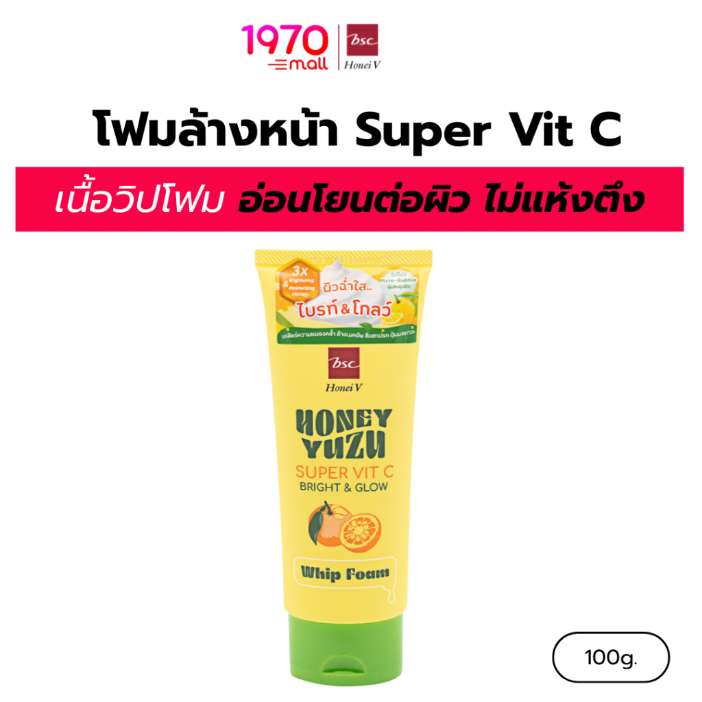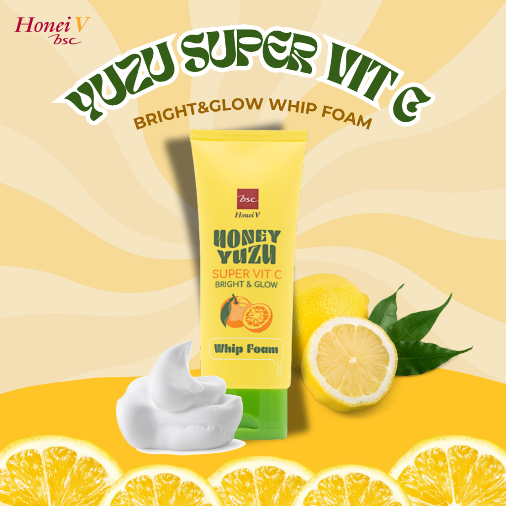 HONEI V BSC HONEY โฟมล้างหน้า YUZU SUPER VIT C BRIGHT&GLOW WHIP FOAM 100g. สูตร Super Vit C ทำความสะอ าดผิวพร้อมบำรุง