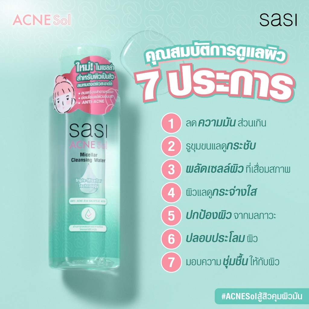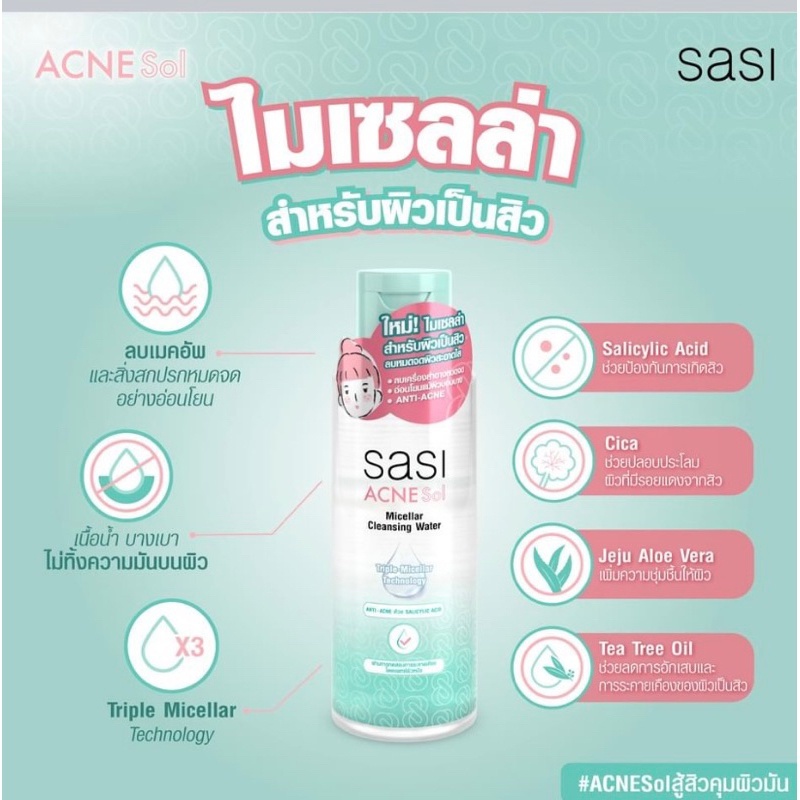 ศศิ แอคเน่ โซล ไมเซลล่า คลีนซิ่ง วอเตอร์ 100 ml. Sasi ACNE Sol Cleansing Water