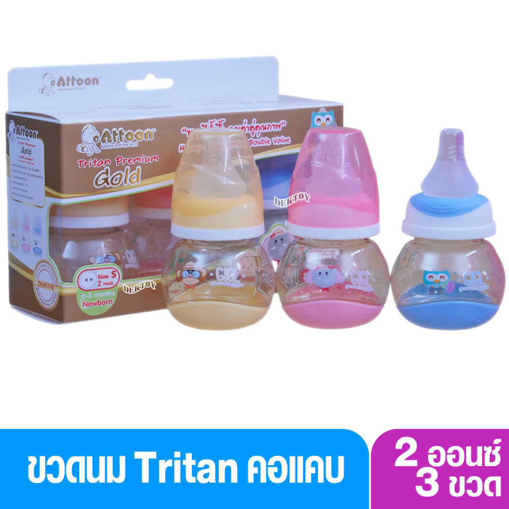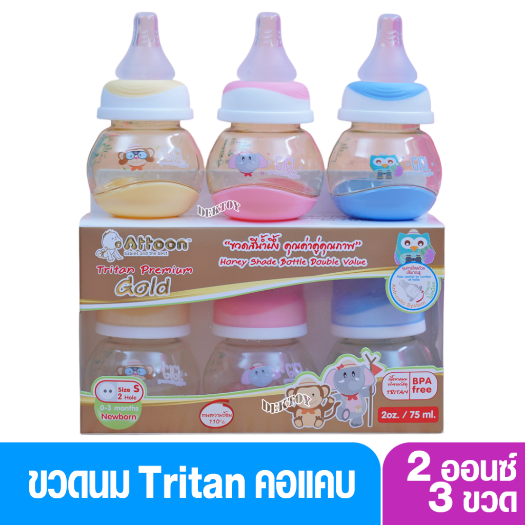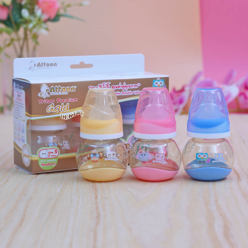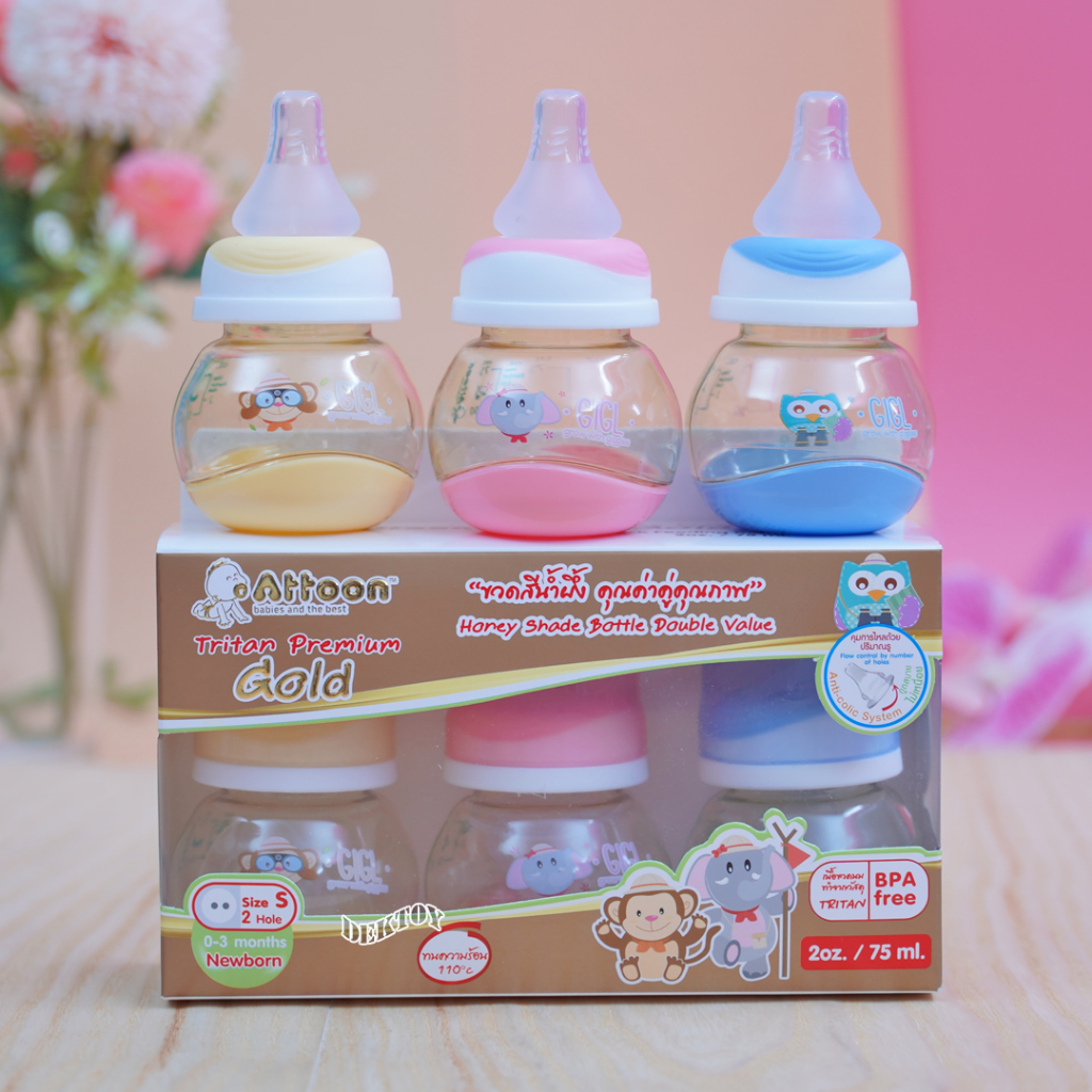 แพ็ค 3 ขวด Attoon แอทตูน ขวดนมสำหรับเด็กแรกเกิดคอแคบ Premium Gold ขวดนมสีน้ำผึ้ง 2 ออนซ์ จุกนมเกรดนุ่มพิเศษ