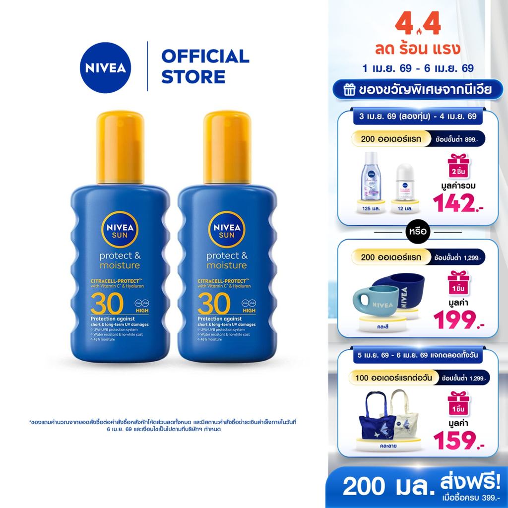 นีเวีย ซัน โพรเท็คแอนด์มอยซ์เจอร์ เอสพีเอฟ30 ยูวีเอ/ยูวีบี สเปรย์ สเปรย์กันแดดสูตรกันน้ำ 200 มล.2 ชิ้น NIVEA