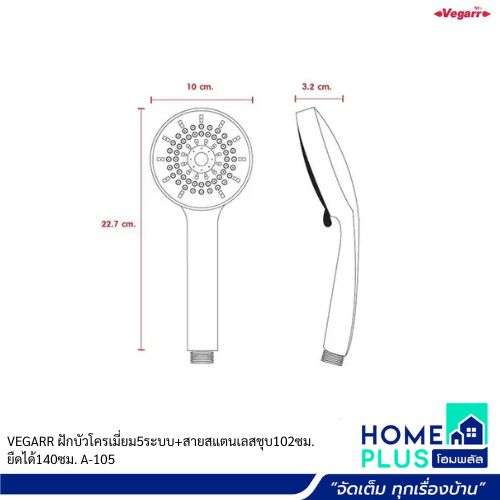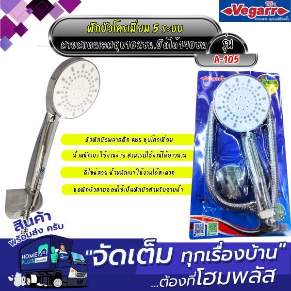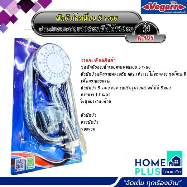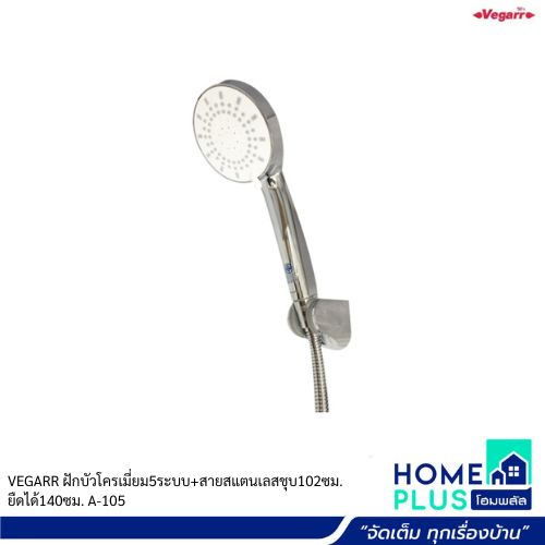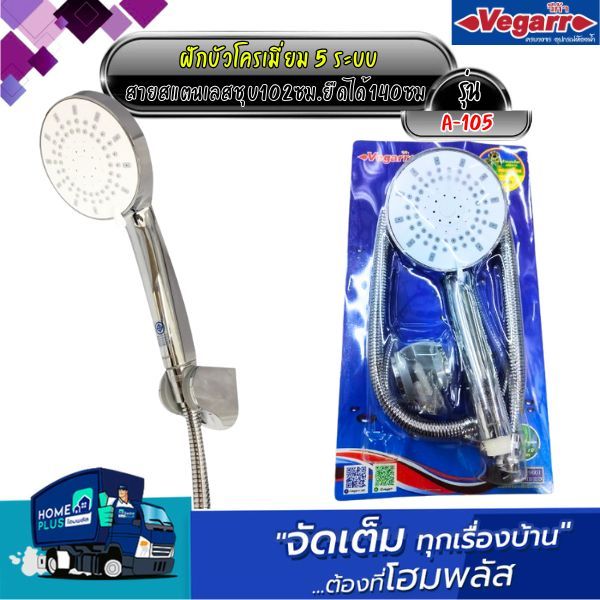 VEGARR ฝักบัวโครเมี่ยม5ระบบ+สายสแตนเลสชุบ102ซม.ยืดได้140ซม. A-105