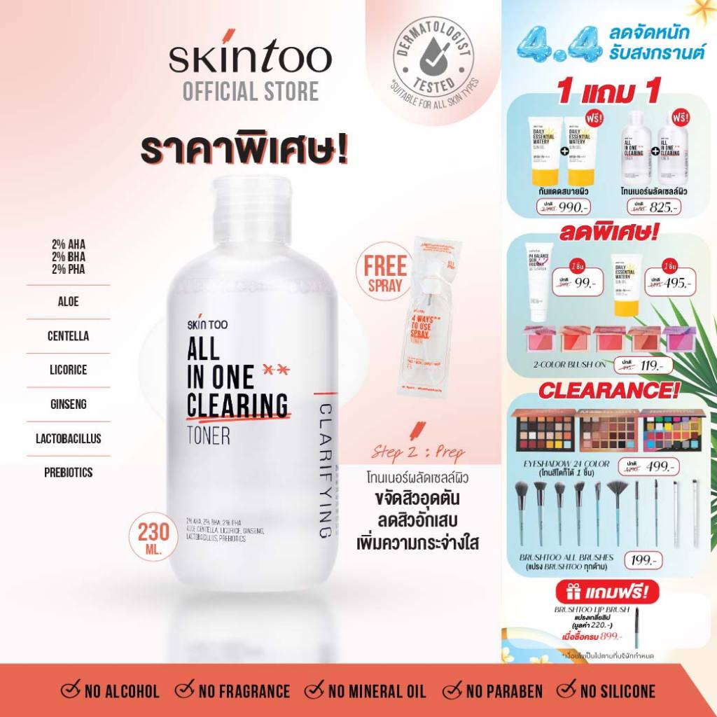 โทนเนอร์ลดสิว ผิวกระจ่างใส ผลัดผิวอ่อนโยน AHA BHA PHA ขจัดสิวหัวดำและหัวขาว Clearing Toner 230ml SKINTOO