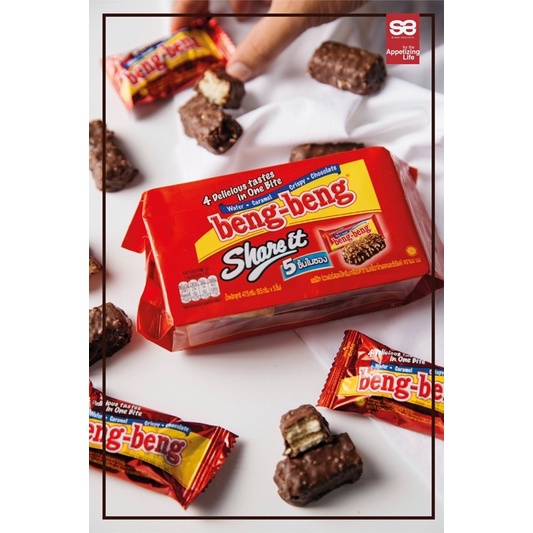 Beng Beng share it เบงเบง แชร์อิท เวเฟอร์สอดไส้ครีมเคลือบคาราเมลช็อกโกแลต ขนาด 9.5กรัมx5ชิ้นx6ถาด = 30ชิ้น [ขนม]