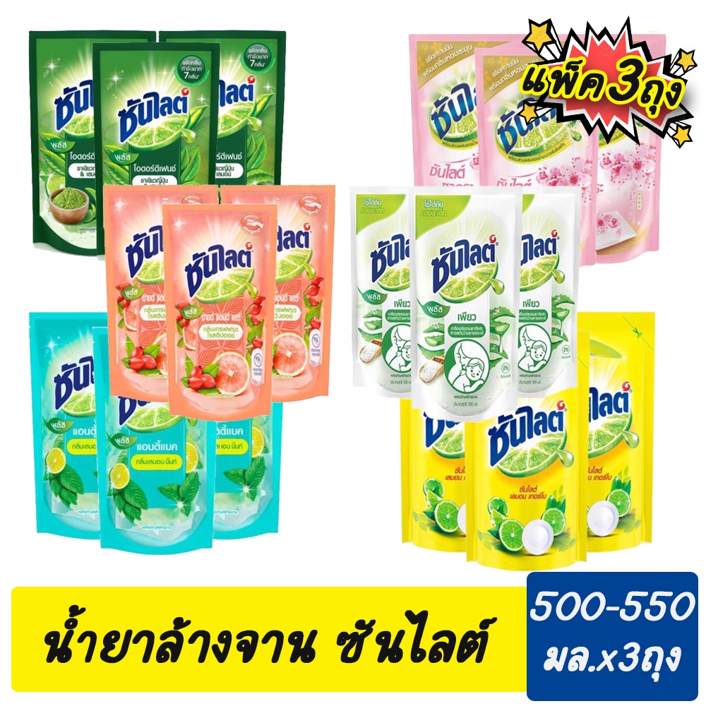 (แพ็ค 3) Sunlight Dishwashing Liquid ซันไลต์ ผลิตภัณฑ์น้ำยาล้างจาน 450มล. - 500 มล. มี 6 สูตร น้ำยาล้างจาน