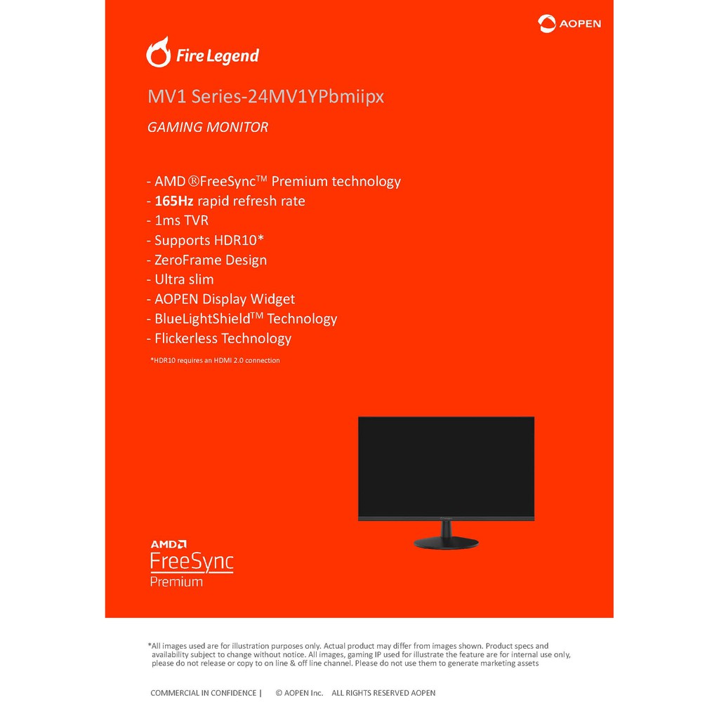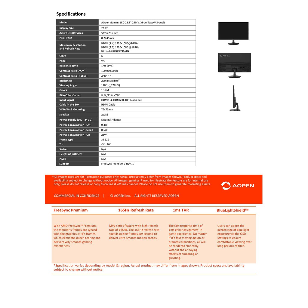 Aopen Monitor 23.8” 24MV1YPbmiipx VA Panel (FHD,HDMI,DP,SPK) OC 165Hz ประกัน Acer 3 ปี