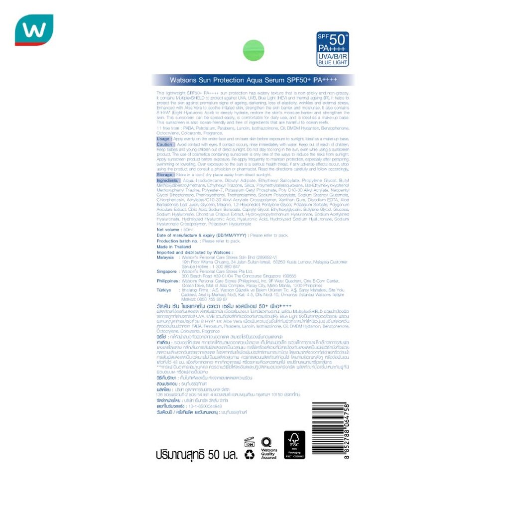 Watsons วัตสัน ซัน โพรเทคชั่น อะควา เซรั่ม เอสพีเอฟ 50+ พีเอ++++