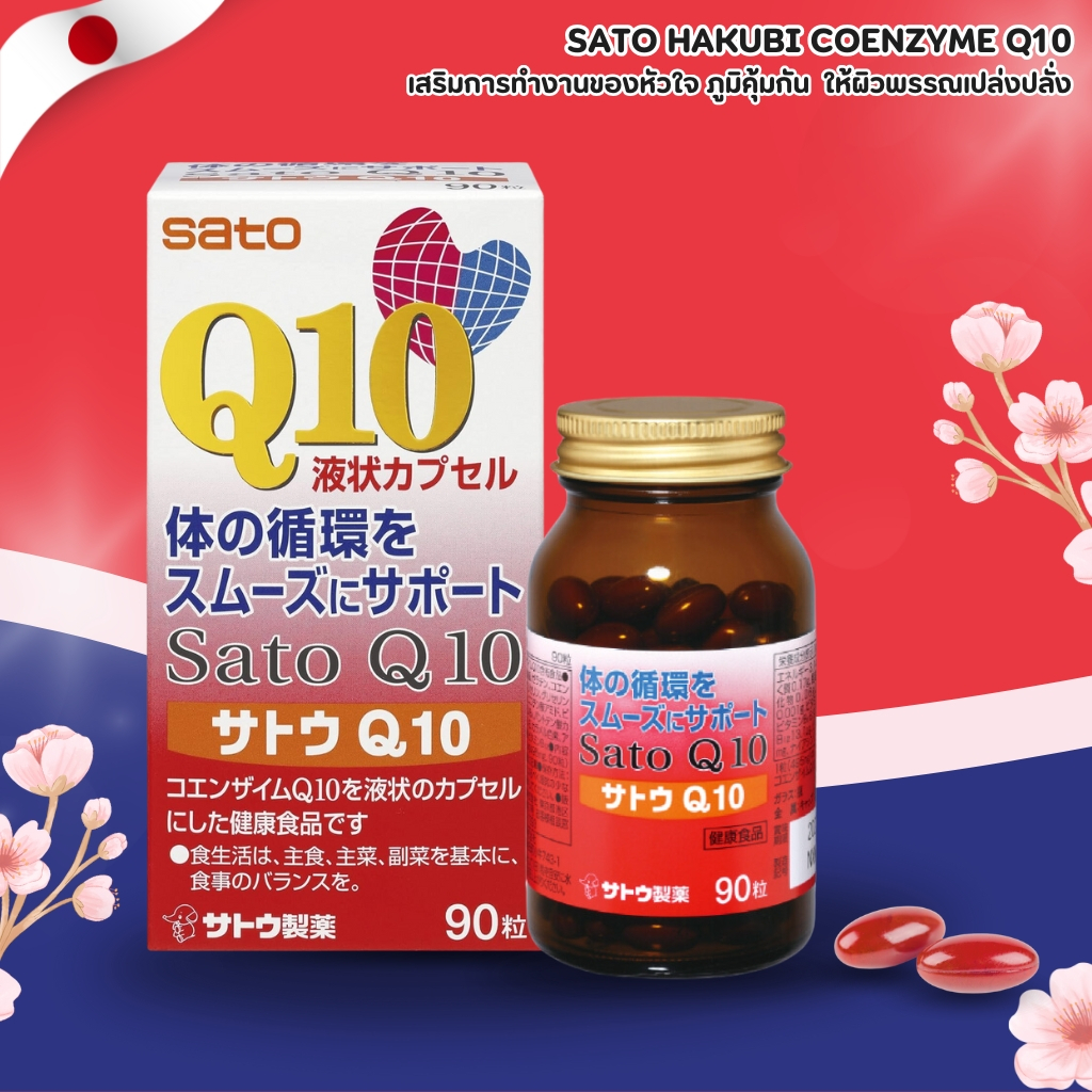 Sato Q10 Softgel 💊 โคเอนไซม์ Q10 บำรุงร่างกาย เพิ่มพลังงานและสุขภาพหัวใจ (90 เม็ด) No.Jp2