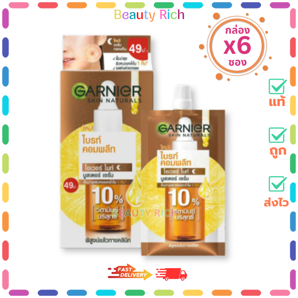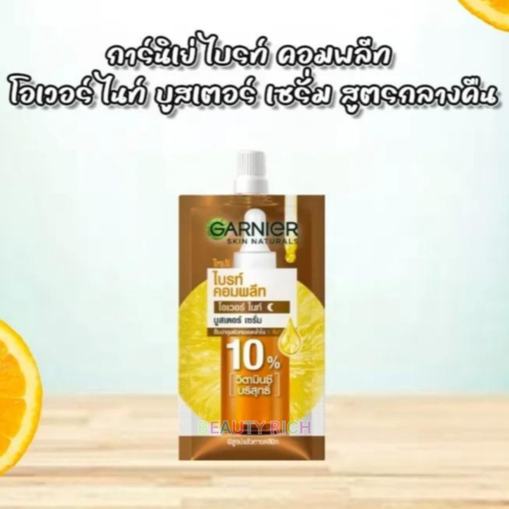 (กล่อง 6 ซอง) Garnier การ์นิเย่ ไบรท์ คอมพลีท โอเวอร์ไนท์ บูสเตอร์ เซรั่ม (7.5 ml.)