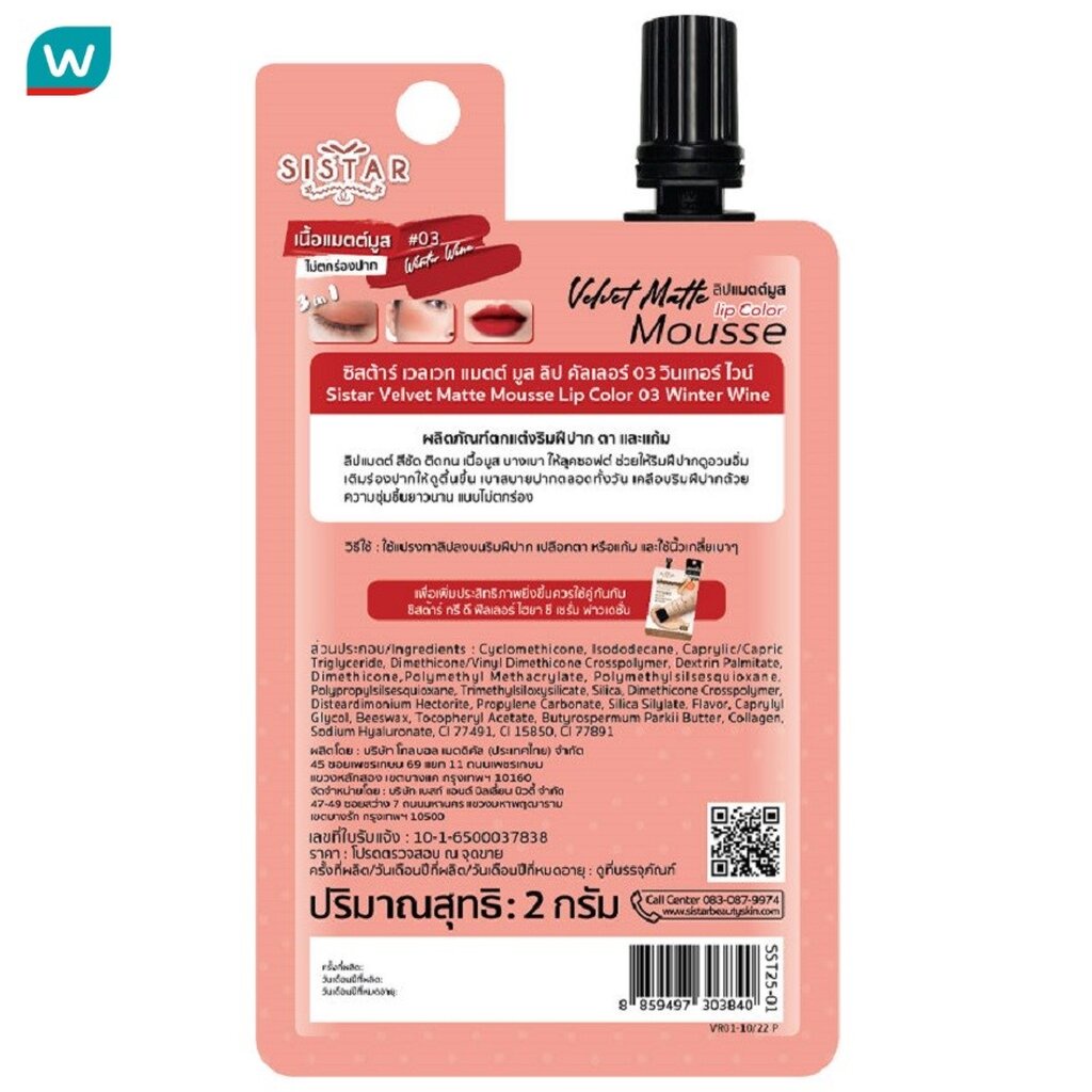 Sistar ซิสต้าร์ เวลเวท แมต มูส ลิป คัลเลอร์ 2ก. 03 วินเทอร์ ไวน์