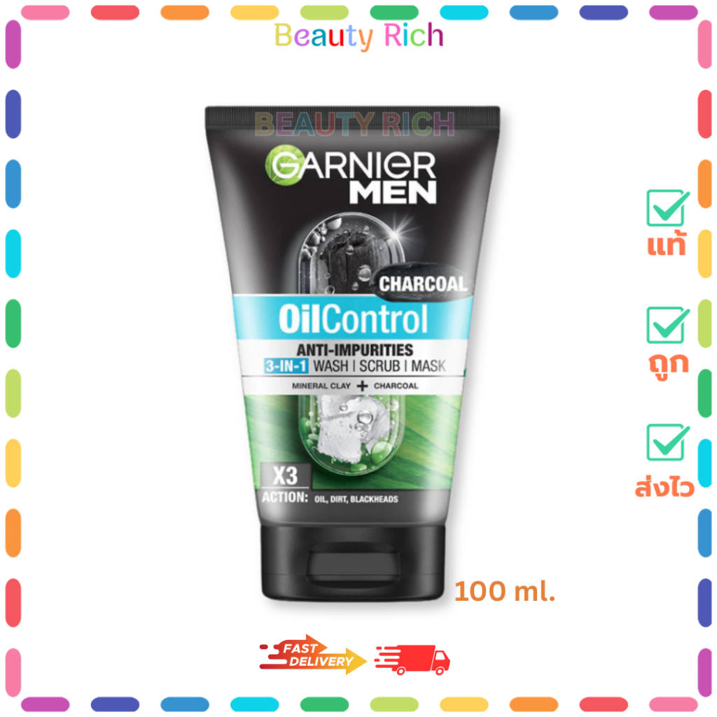 (1 หลอด) Garnier Men การ์นิเย่เมน ออยคอนโทรล แอนตี้-อิมพูริตี้ 3 อิน 1 สครับ มาสก์ (ปริมาณ 100 ml.)