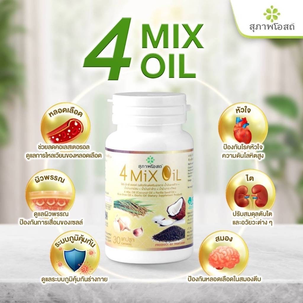4 Mix Oil โฟร์มิกซ์ออยล์ (60แคปซูล) จาก สุภาพโอสถ น้ำมันสกัดมะพร้าว, รำข้าว, งาขี้ม้อน, กระเทียม