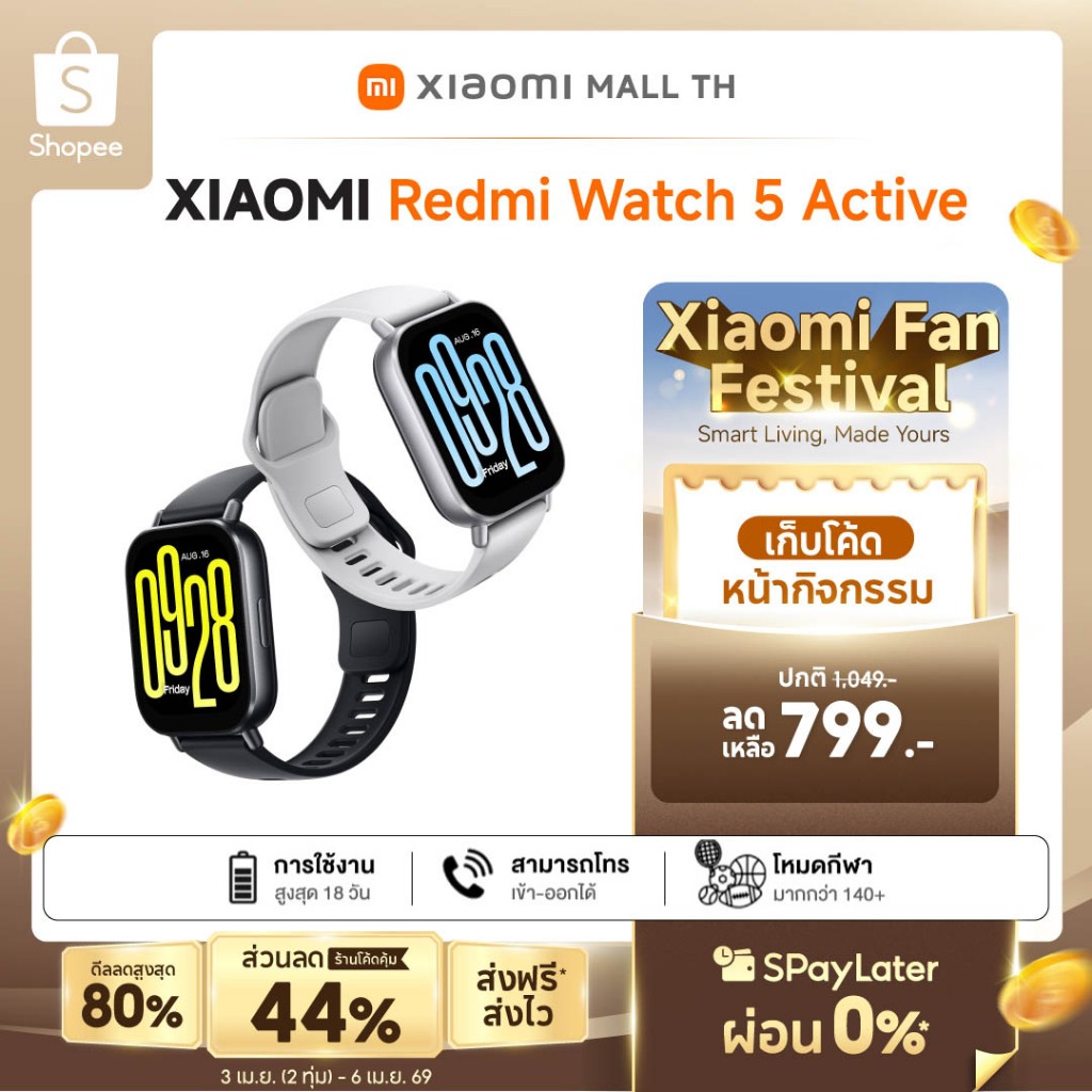 Xiaomi Redmi Watch 5 Active ตรวจวัดอัตราการเต้นหัวใจทั้งวัน หน้าจอ LCD 2 นิ้ว การใช้งานได้นาน 12 วัน