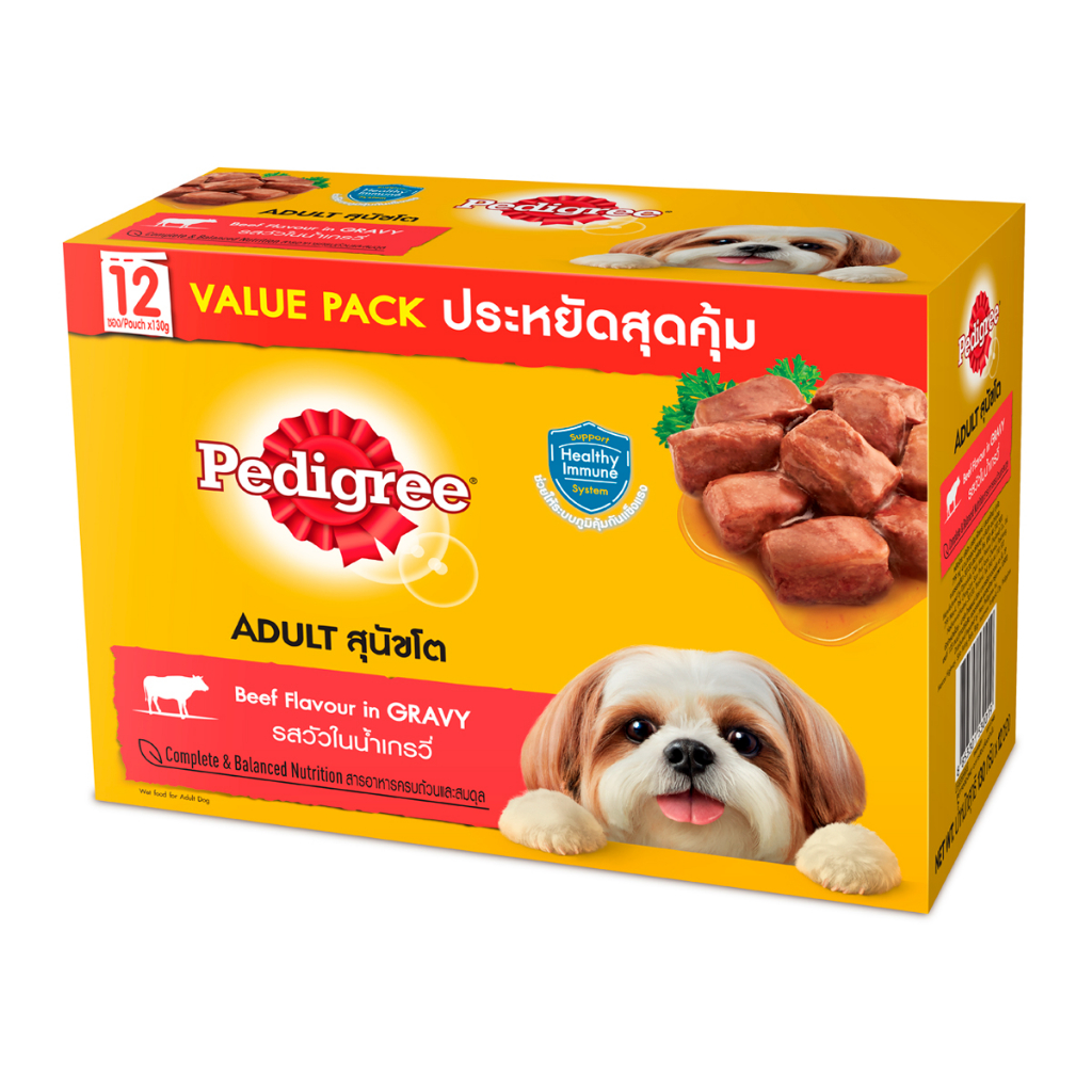 เพดดิกรี อาหารสุนัขชนิดเปียก สำหรับสุนัขโต รสวัวในน้ำเกรวี่ 130 ก. แพ็ค 12
