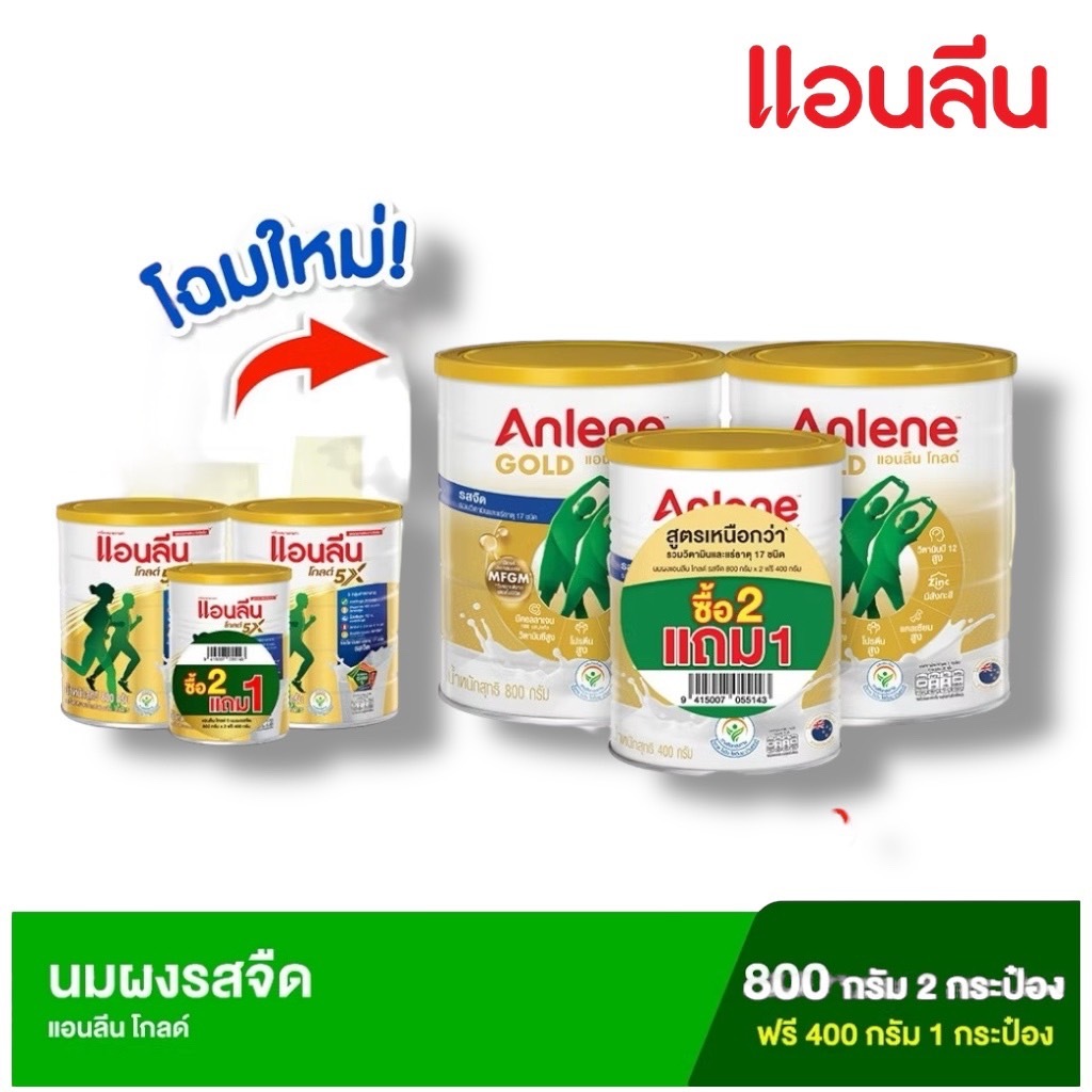 โฉมใหม่!! Anlene Gold แอนลีน โกลด์ นมผง แบบชง แพ็ค2ฟรี1 (800กรัม2 กระป๋องฟรี400 กรัม1กระป๋อง)