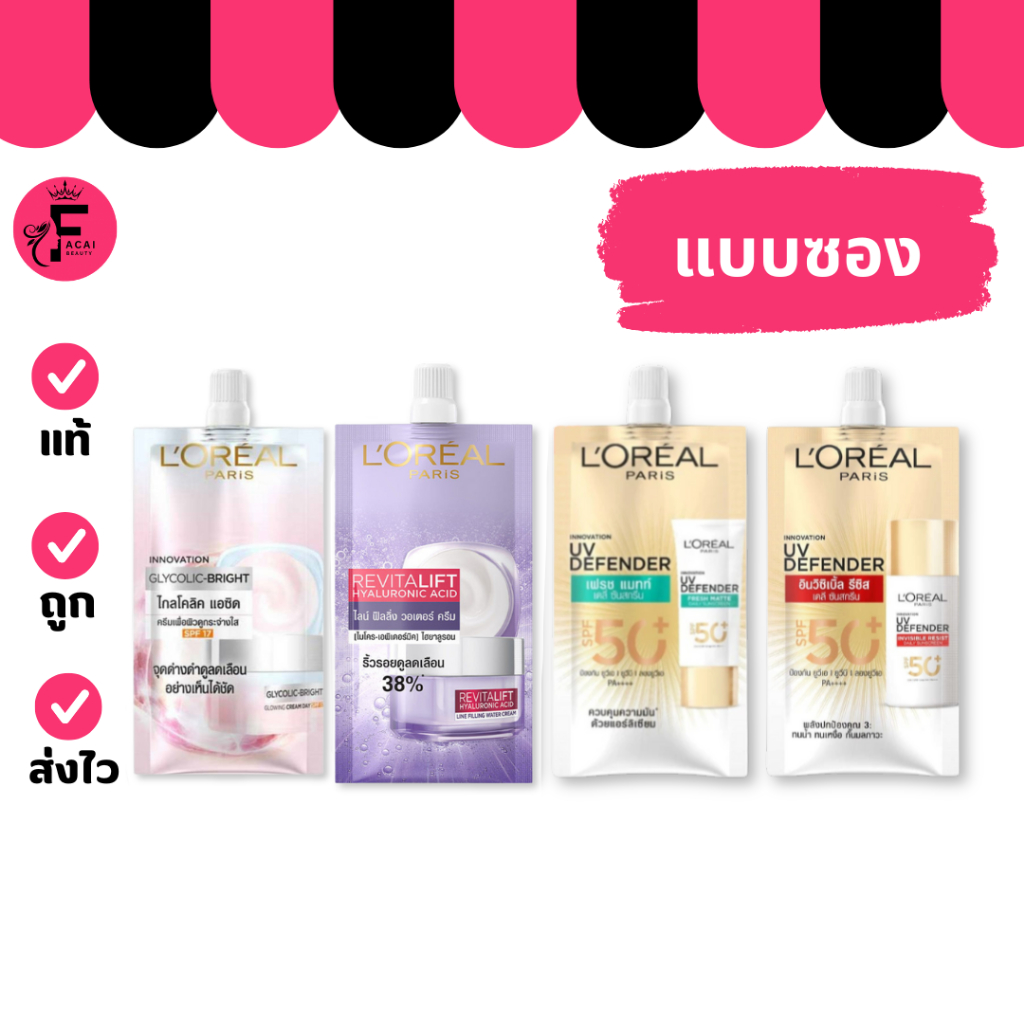 (1 ซอง) LORÉAL Paris ลอรีอัล ครีมกันแดด 2 สูตร/ โกลว์อิ้ง ครีมเดย์/ครีมไฮยาลูรอน (ปริมาณ 5.5/7 ml.)