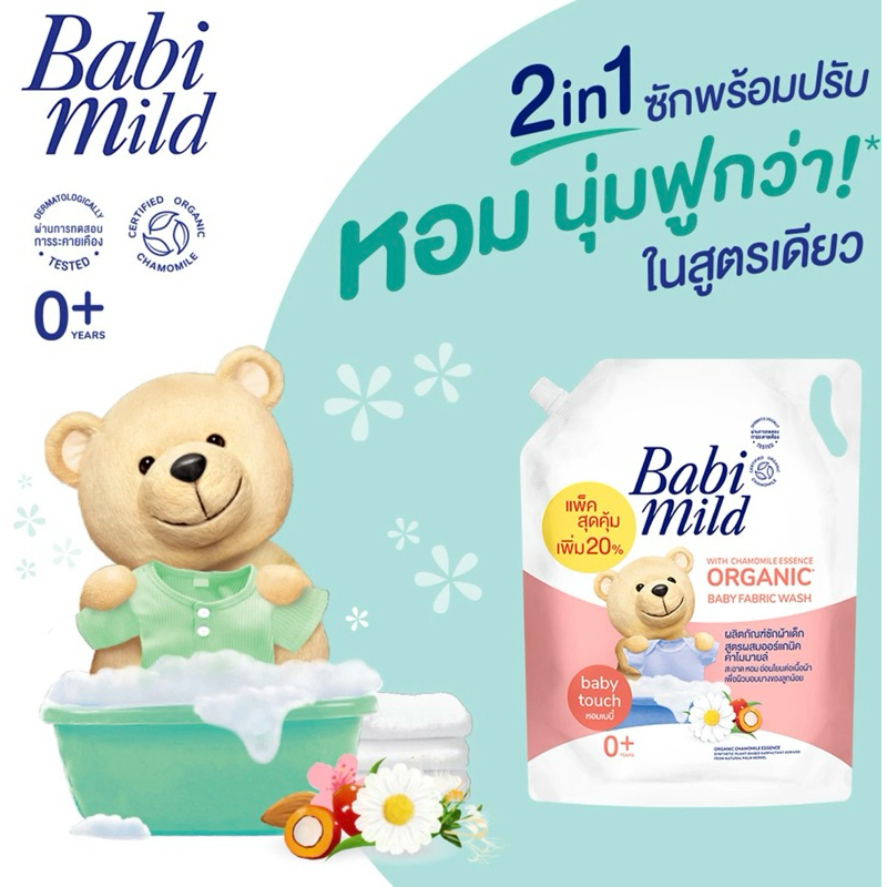 Babi Mild Organic เบบี้มายด์ ผลิตภัณฑ์ซักผ้าเด็กผสมปรับผ้านุ่ม กลิ่นเบบี้ทัช ชนิดเติม2400 มล.
