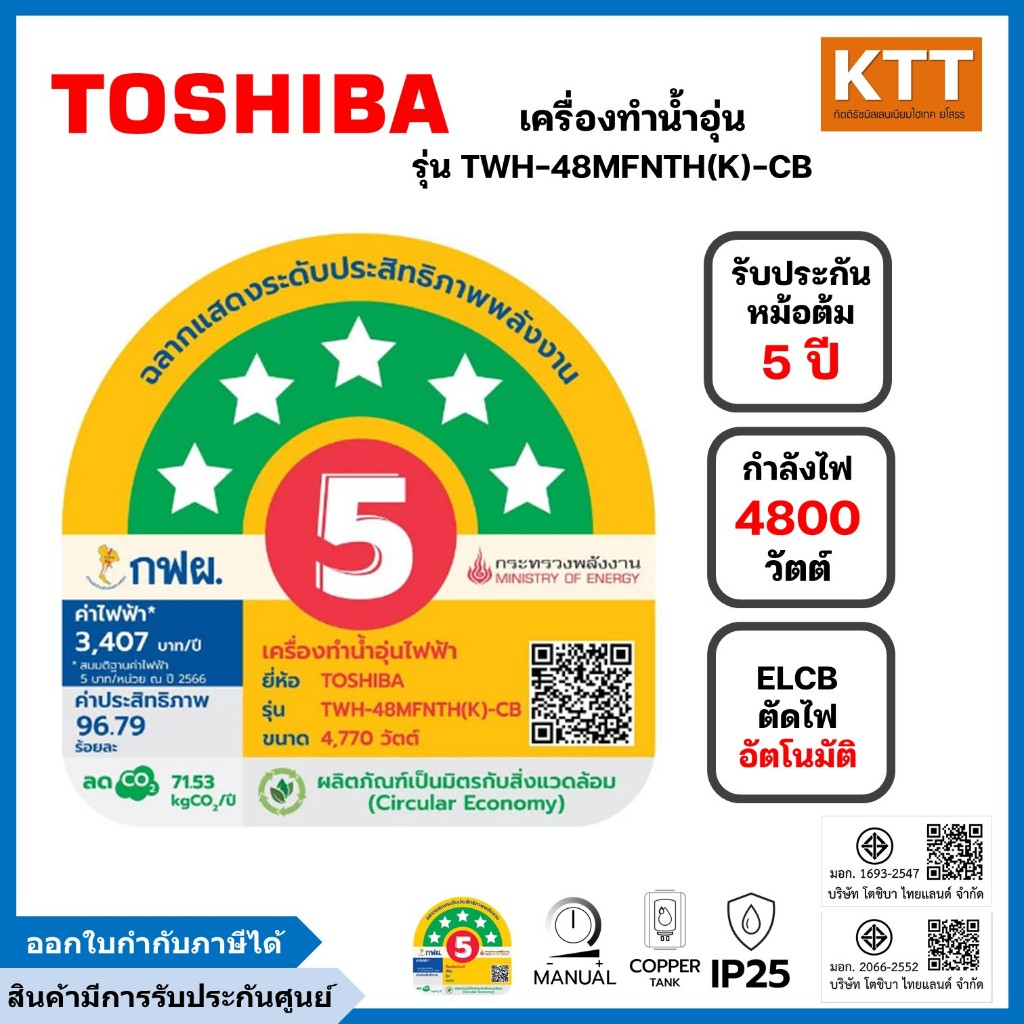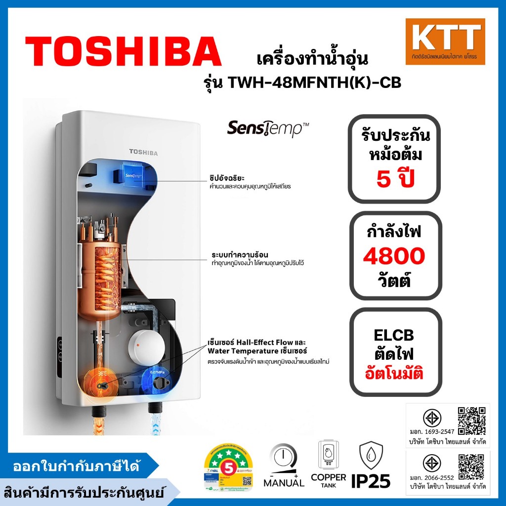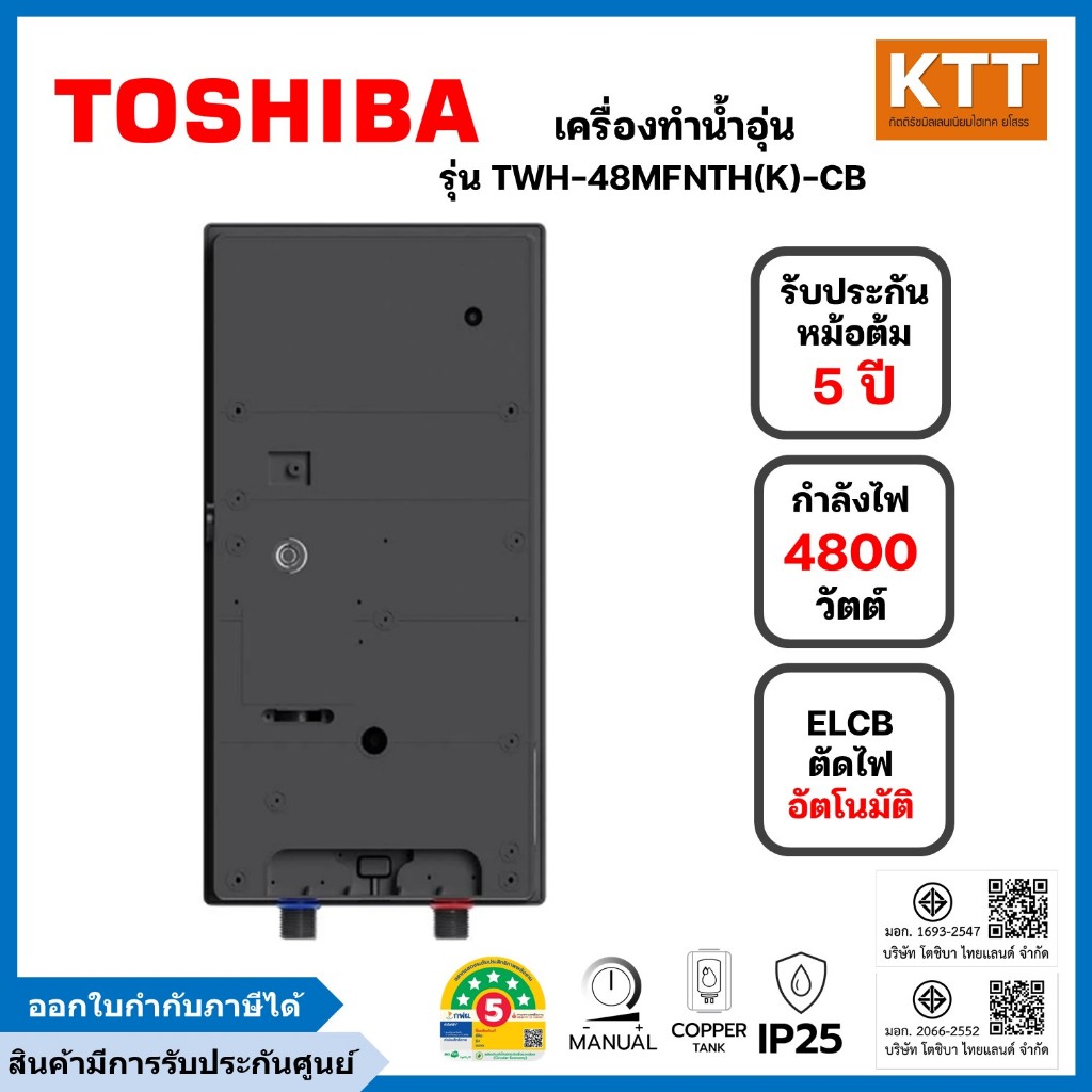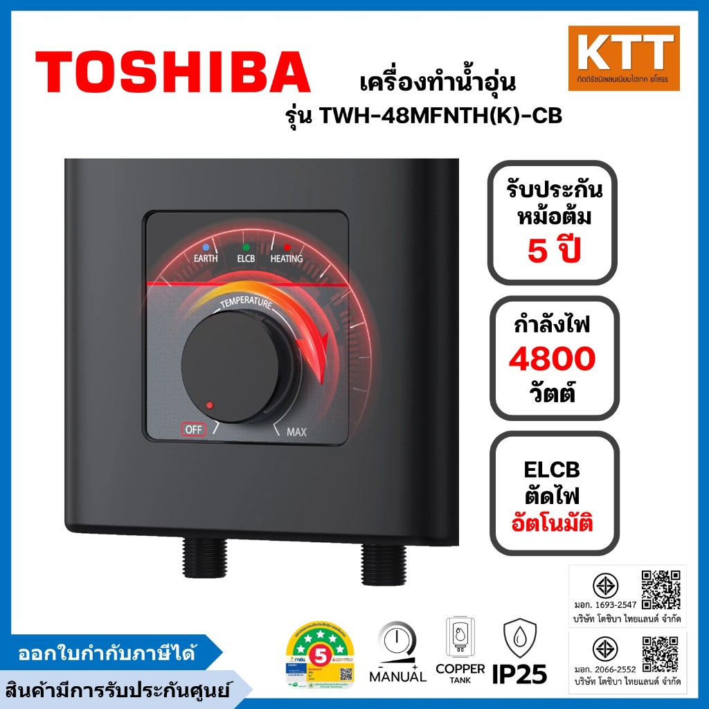 TOSHIBA เครื่องทำน้ำอุ่น 4,800 วัตต์ รุ่น TWH-48MFNTH(K)-CB สีดำ