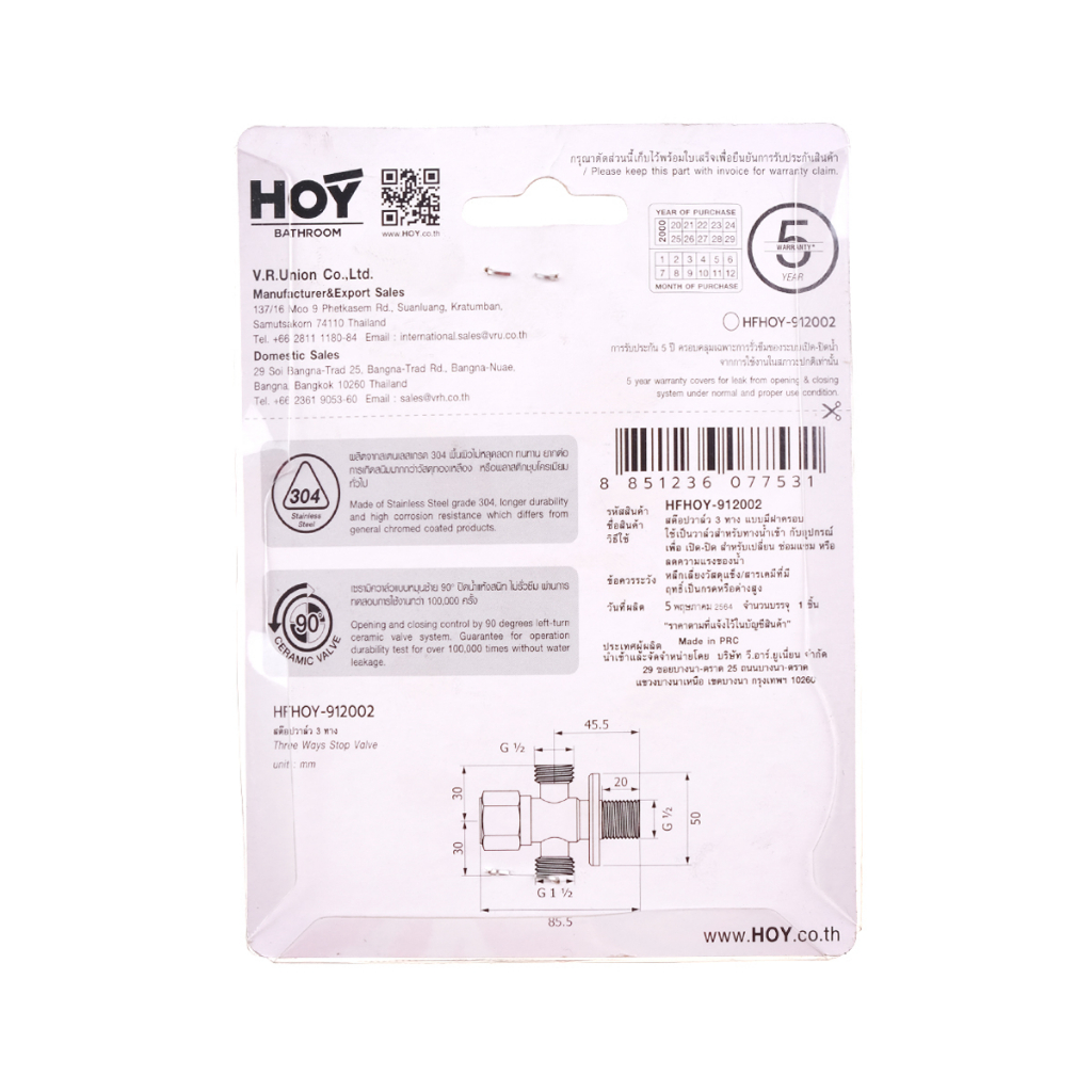 HOY สต๊อปวาล์ว 3 ทาง รุ่น HF-912002 |EA|