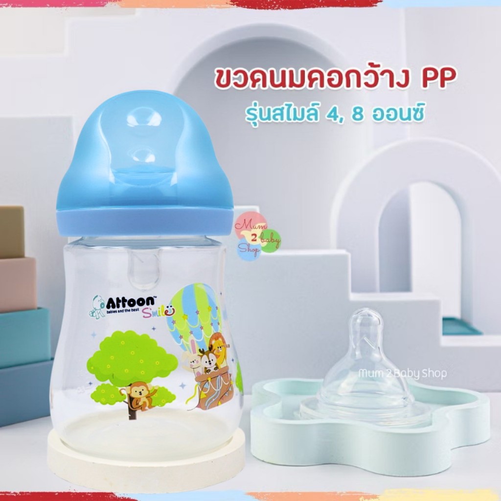 Attoon ขวดนมคอกว้าง PP รุ่นสไมล์ 4,8ออนซ์ พร้อมจุกนมทุกขวด SmiLe