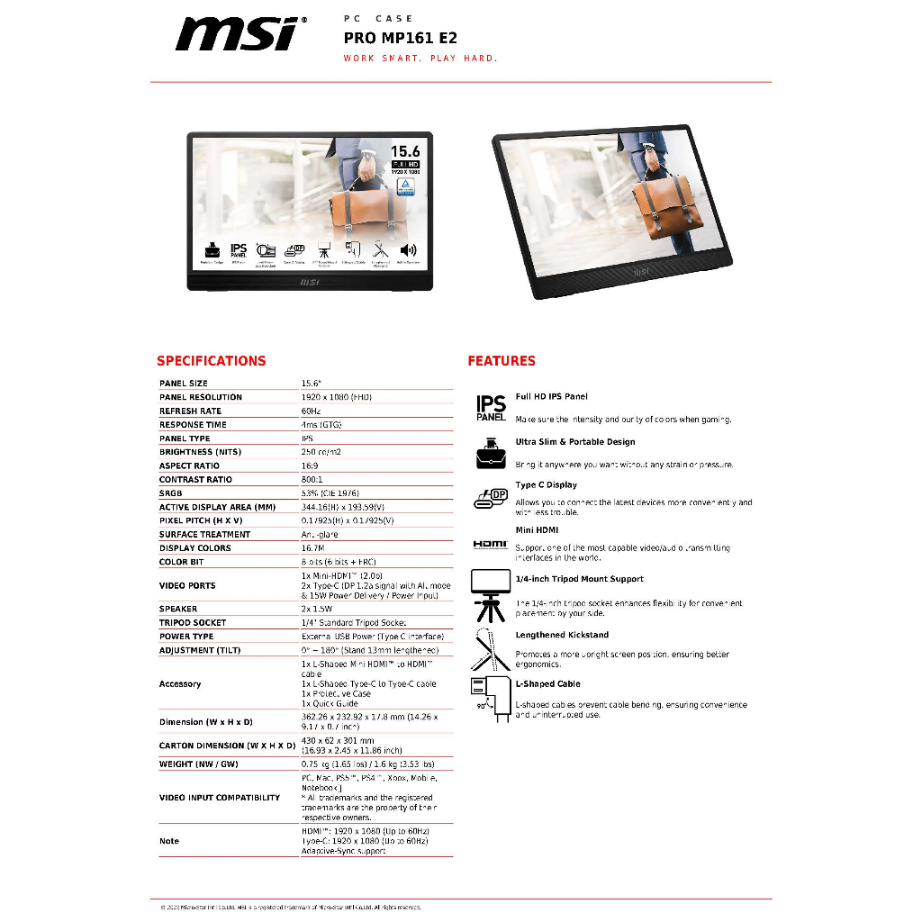 MSI PRO MP161 E2 15.6" IPS FHD Ultra Slim Portable Monitor, 60Hz, Type-C, Mini HDMI, Speakers รับประกันสินค้าศูนย์ 3 ปี