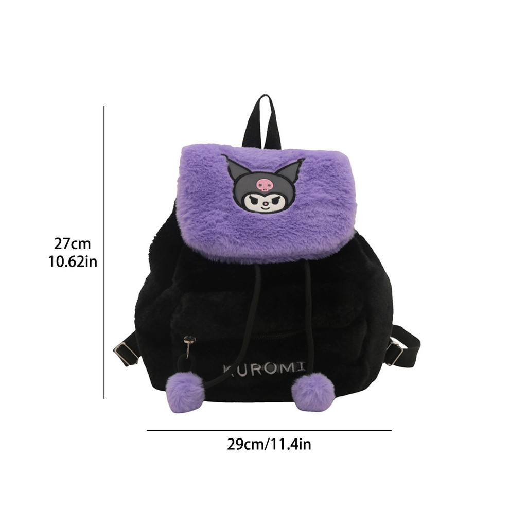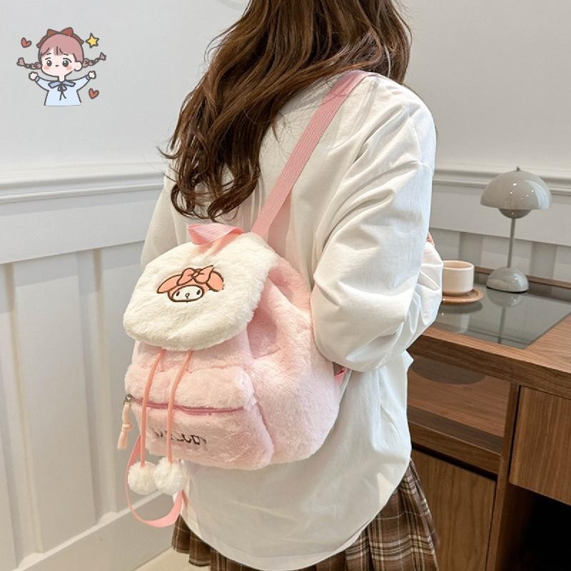 SANRIO ซานริโอ กระเป๋าเป้สะพายหลังนุ่มปุยกระเป๋าเป้สะพายหลัง เชือกรูด กระเป๋าเป้สะพายหลังตุ๊กตาการ์ตูนแฟชั่นกระเป๋าเป้สะพายหลัง
