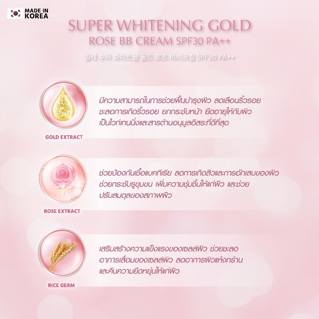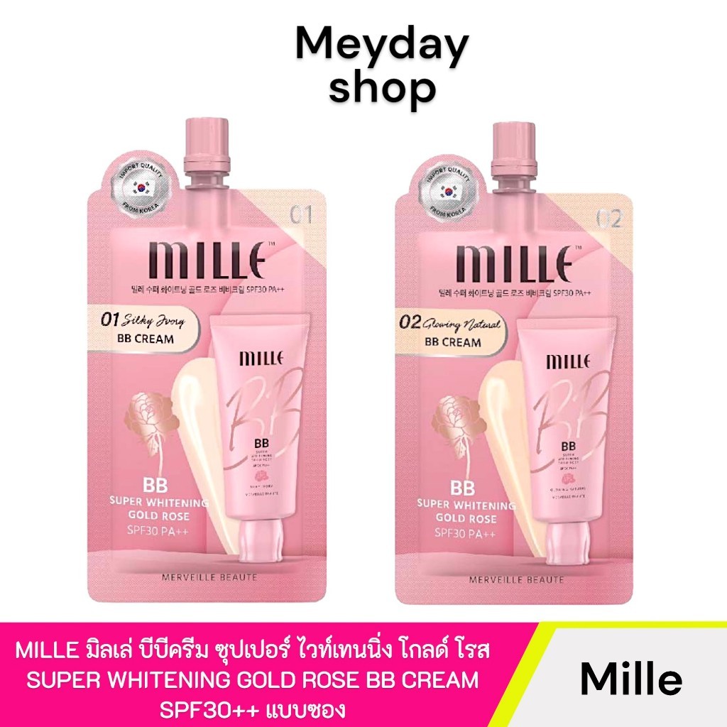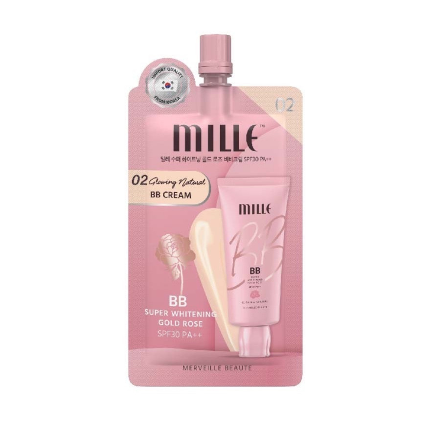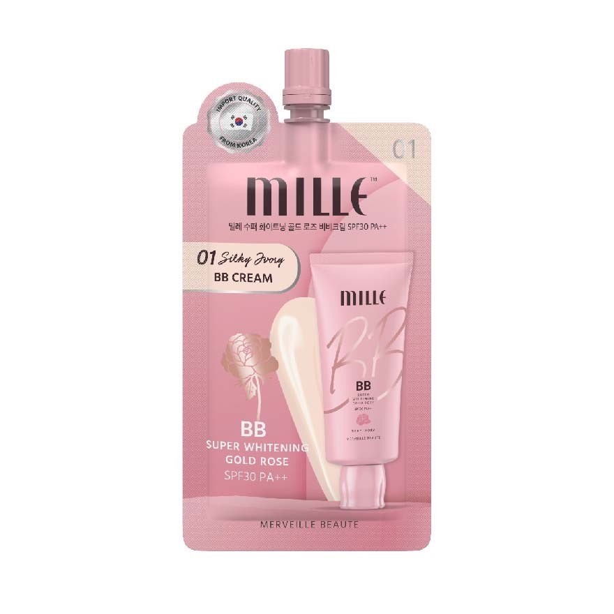 MILLE มิลเล่ บีบีครีม ซุปเปอร์ ไวท์เทนนิ่ง โกลด์ โรส SUPER WHITENING GOLD ROSE BB CREAM SPF30++ แบบซอง 6g