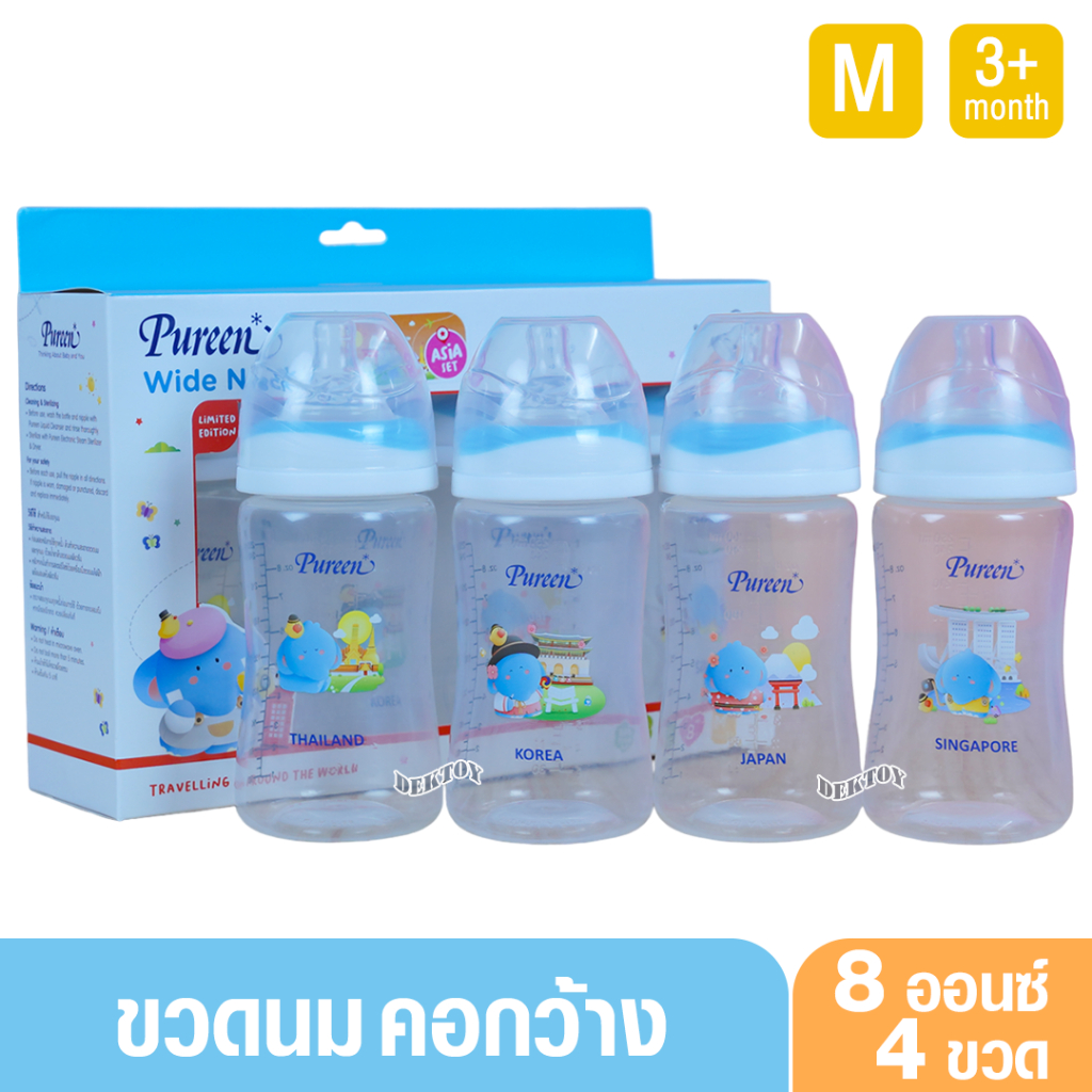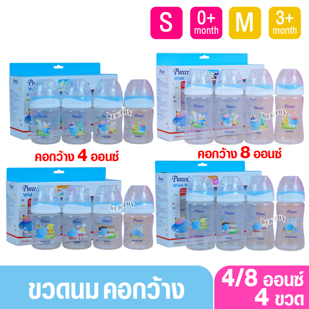 แพ็ค4ขวด Pureen เพียวรีน ขวดนมเพียวรีน PP คอกว้าง ลายAsia/Europe 4 และ 8 ออนซ์