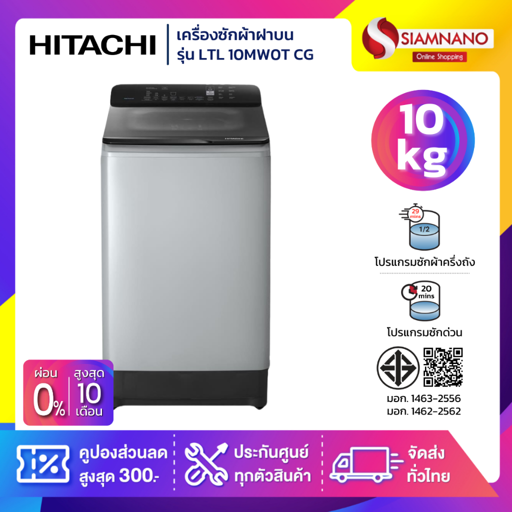 เครื่องซักผ้าฝาบน Hitachi รุ่น LTL 10MW0T CG ขนาด 10 kg. (รับประกันนาน 10 ปี)