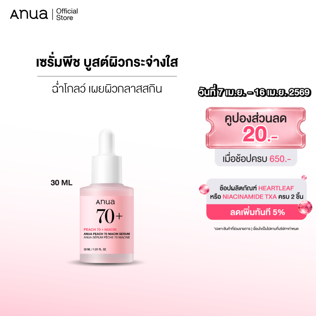 Anua Peach 70 Niacin Serum อานัว เซรั่มพีช เซรั่มบำรุงผิวกระจ่างใส ผิวนุ่มชุ่มชื้นอิ่มฟู โกลว์ใสอมชมพูอย่างธรรมชาติ 30ml