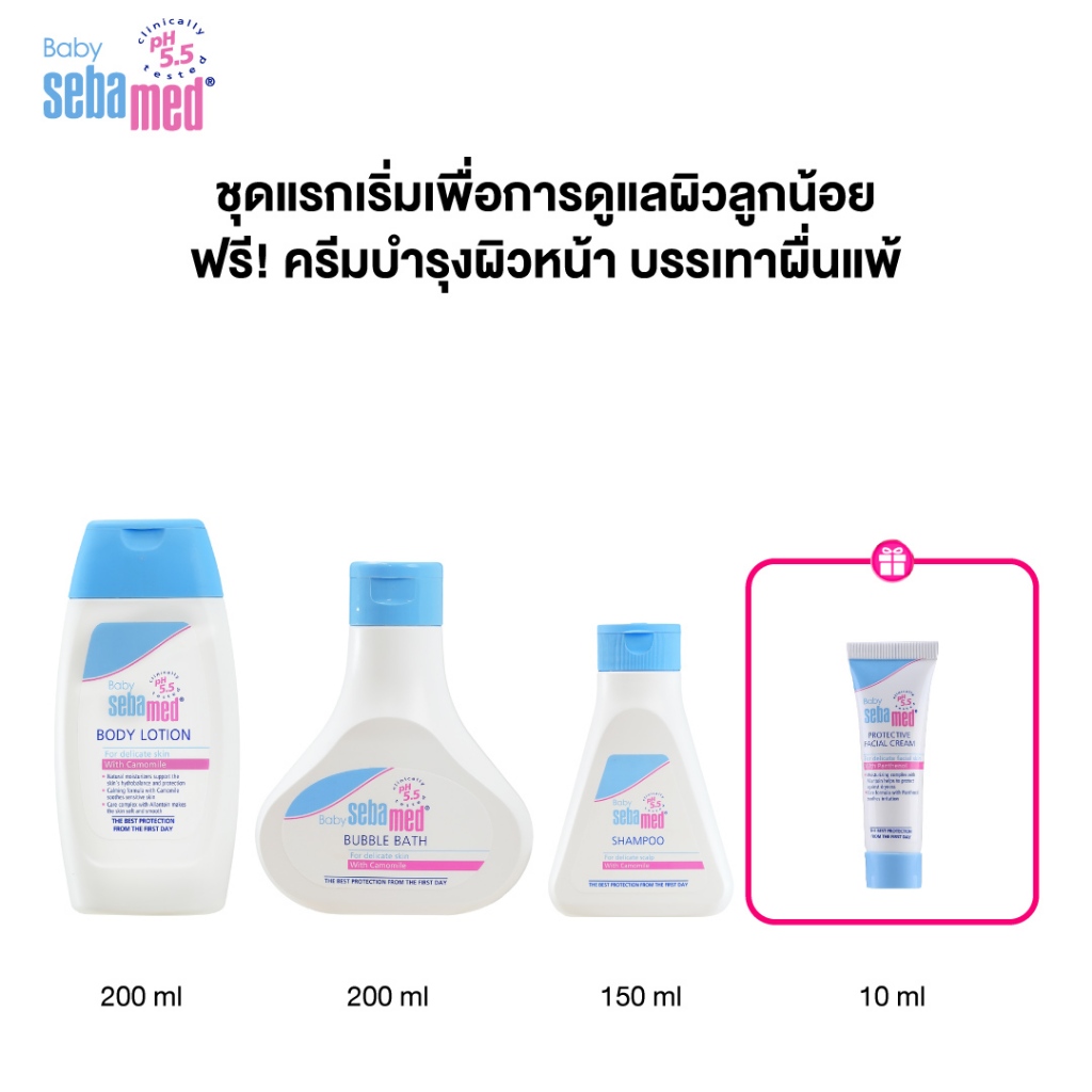 เซ็ต 3+1 : SEBAMED BABY LOTION 200ML + Baby Bubble Bath 200ML + Baby Shampoo 150ML ฟรี! Protective Facial Cream 10ML