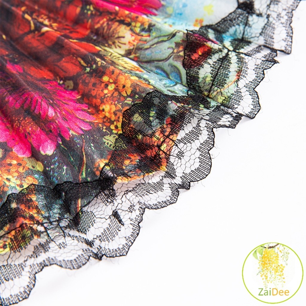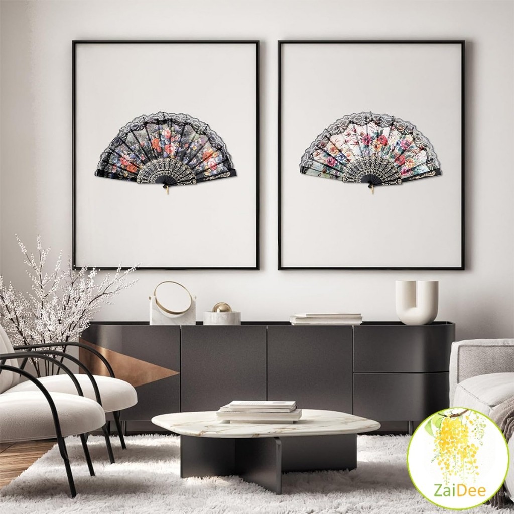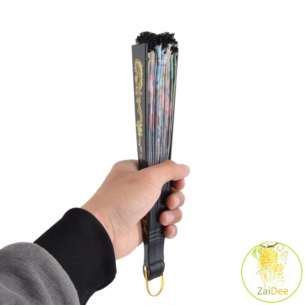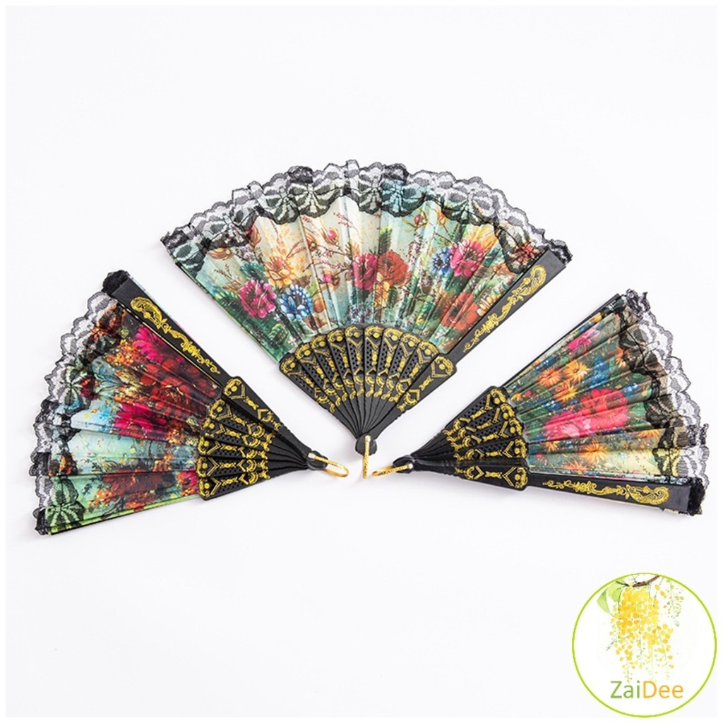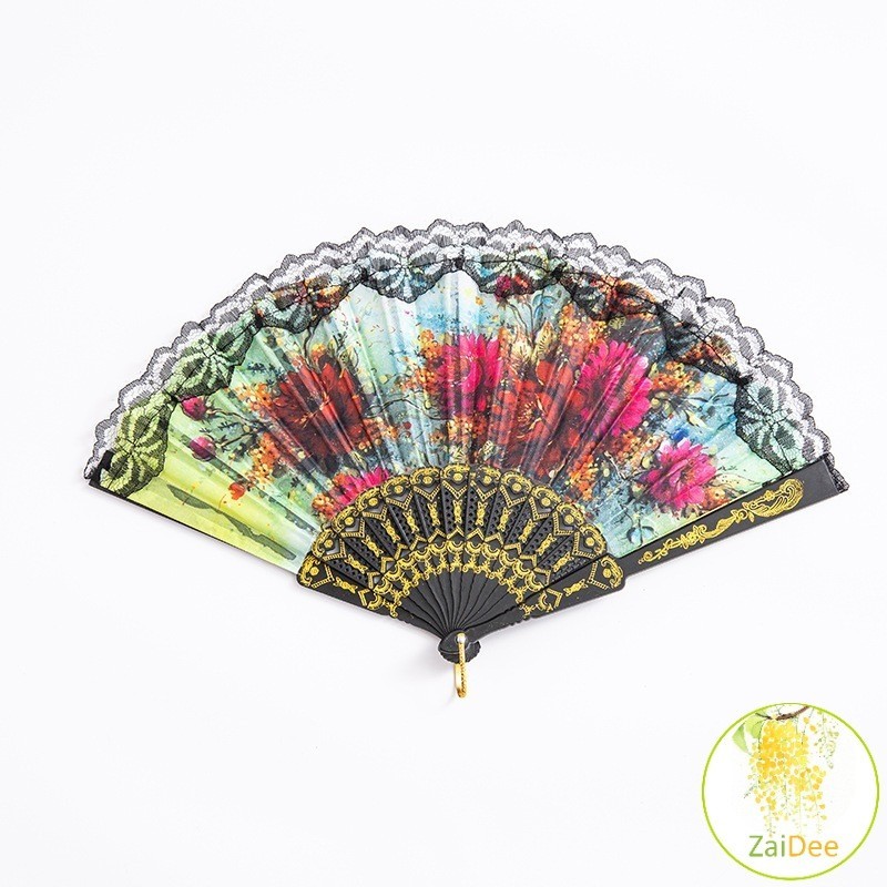 พัดจีนพัดสไตล์วินเทจ พัดแต่งขอบลูกไม้สีดำ แบบพับได้ Lace fan