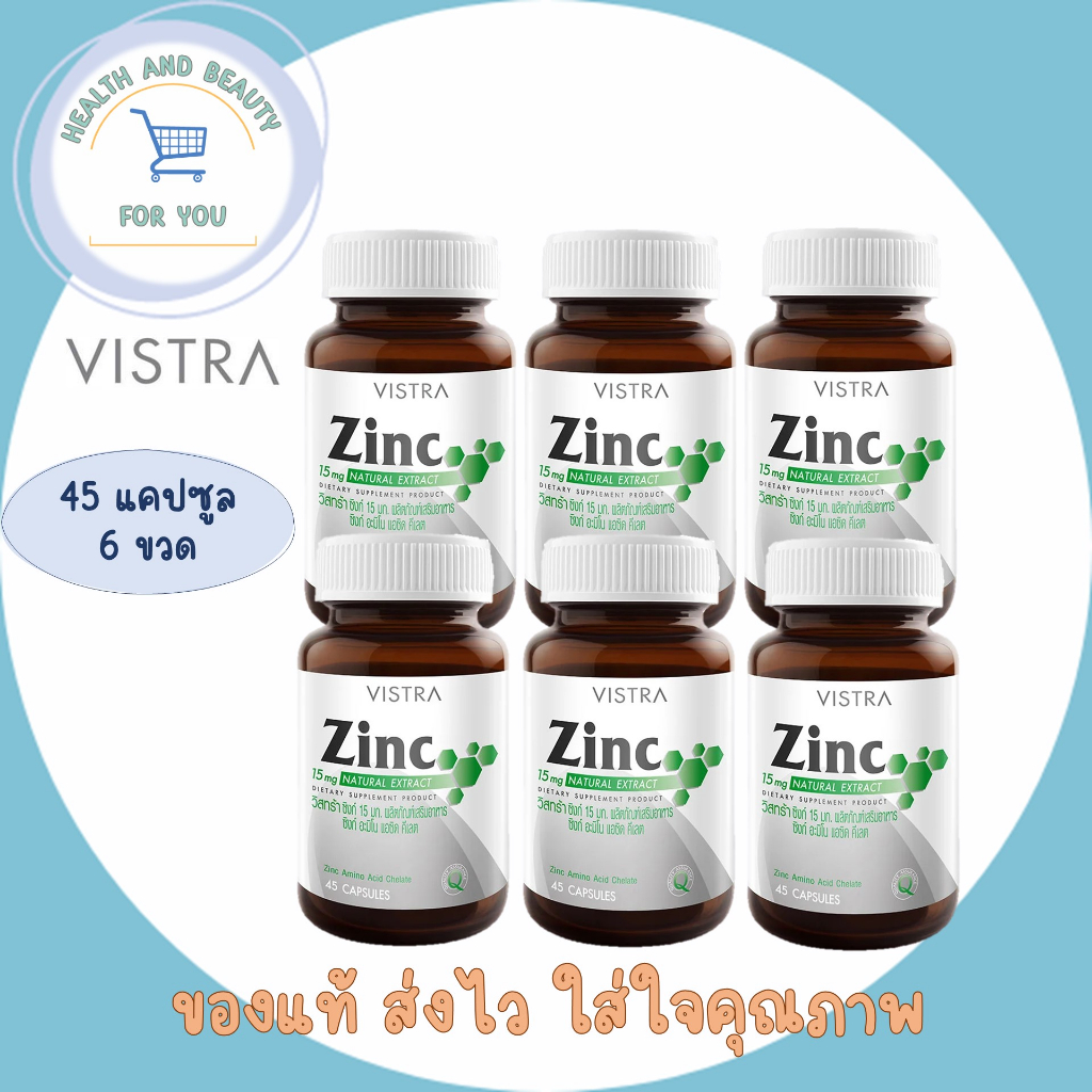 VISTRA ZINC 15 MG.วิสทร้า ซิงค์ 15 มก.(45 แคปซูล)เสริมสร้างภูมิต้านทานให้กับร่างกาย บรรเทาอาการหวัด จำนวน 6 ขวด