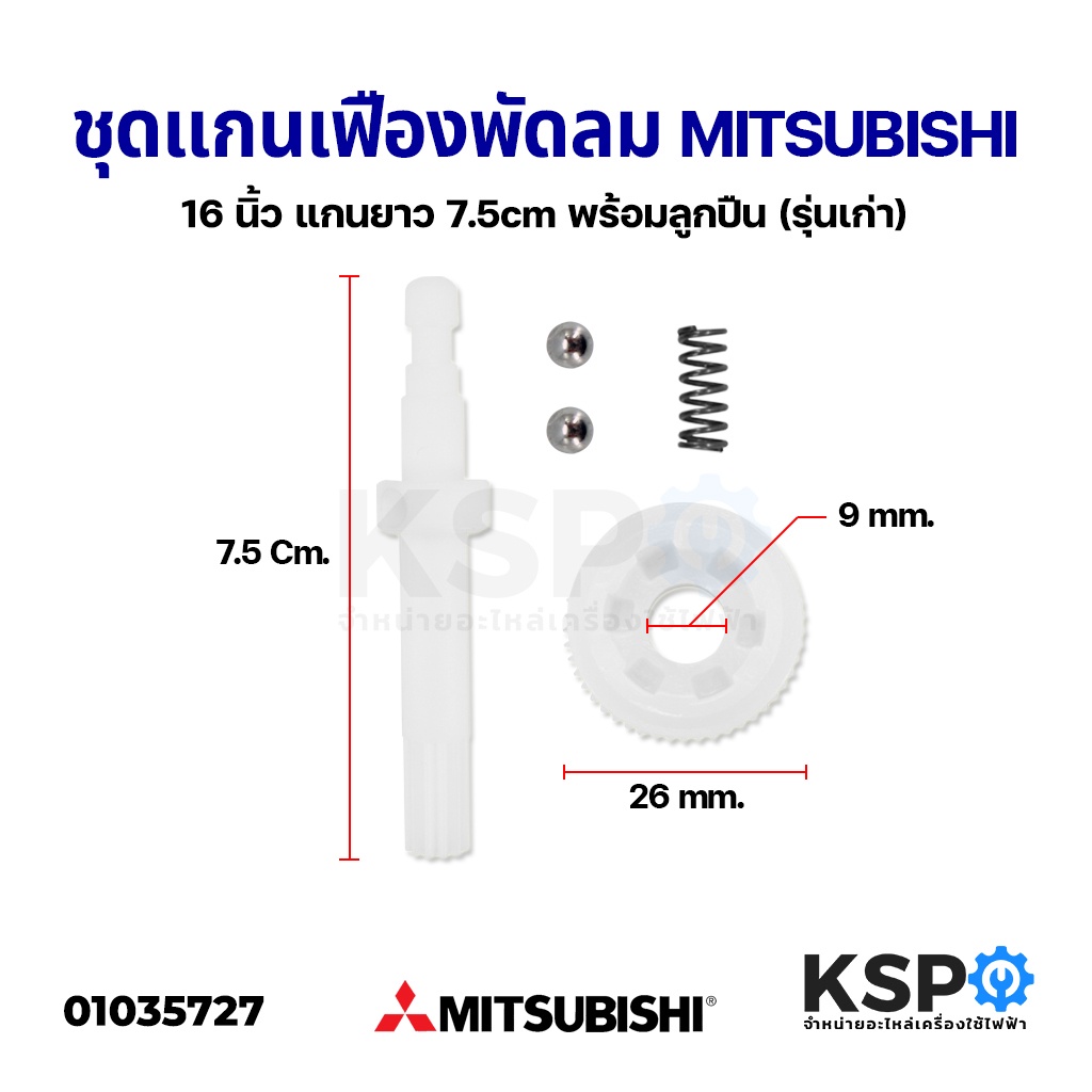 แกนเฟืองพัดลม 16" นิ้ว MITSUBISHI มิตซูบิชิ ยาว 7.5cm เฟืองรูนอก 17.5mm รูใน 9mm (พร้อมสปริงลูกปืน 2 ลูก) อะไหล่พัดลม