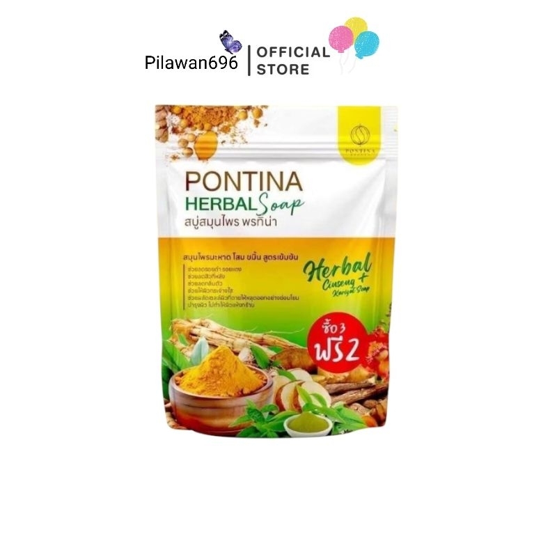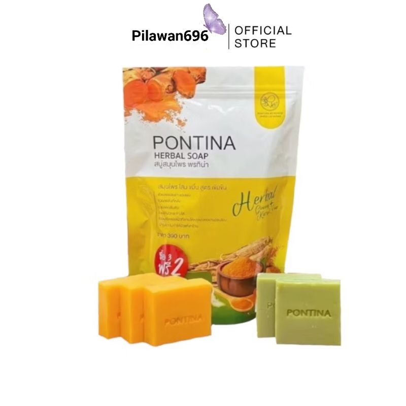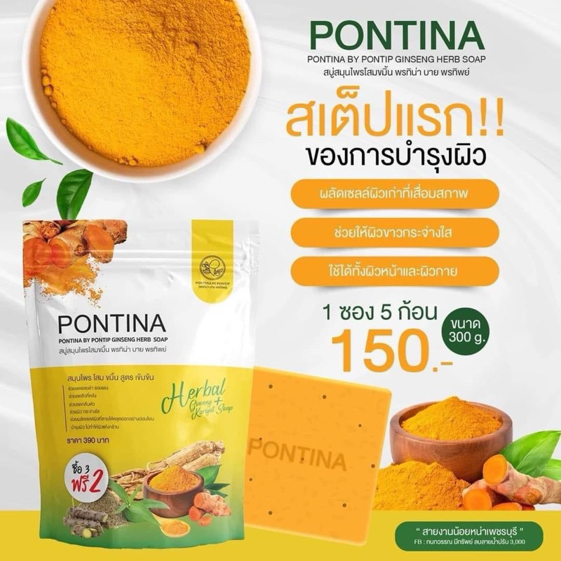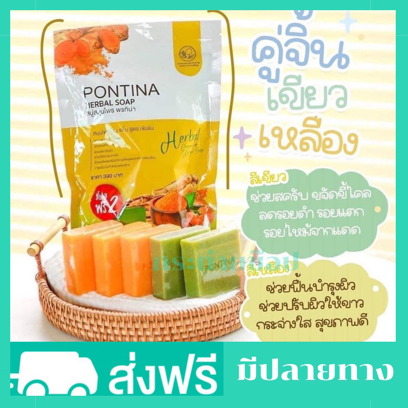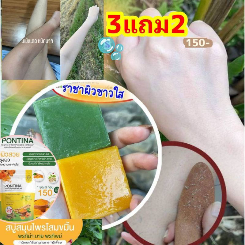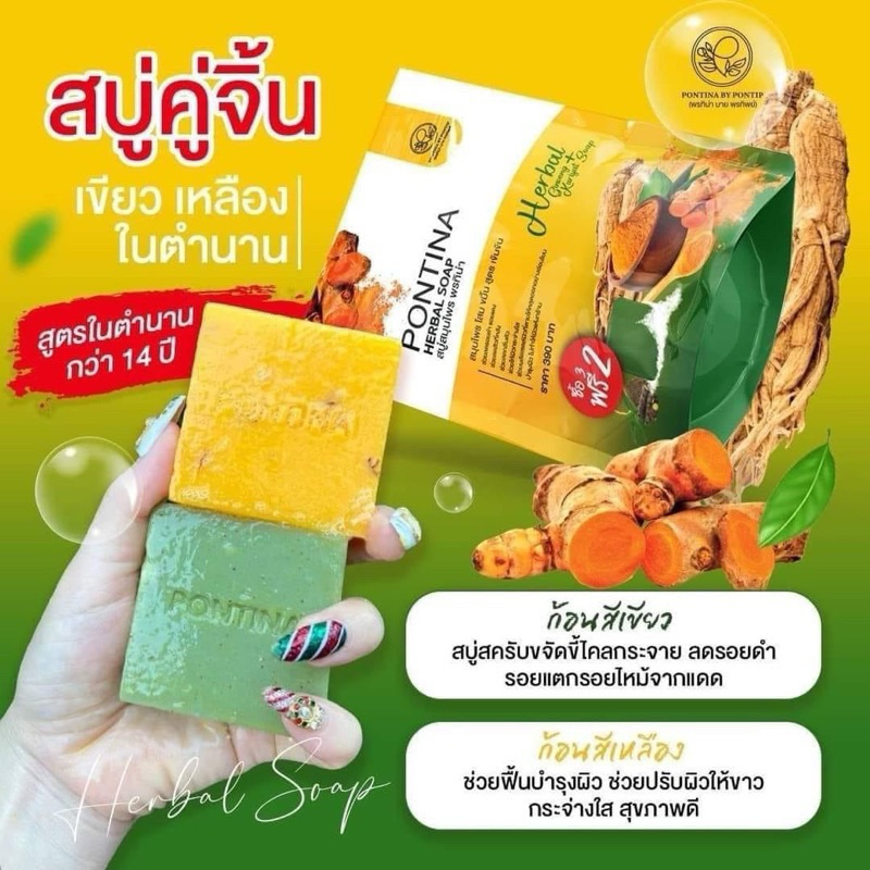สบู่สมุนไพร พรทิน่าของแท้ แพ็กเกจใหม่ 1ห่อมี 5 ก้อน เหลือง3เขียว2ก้อน