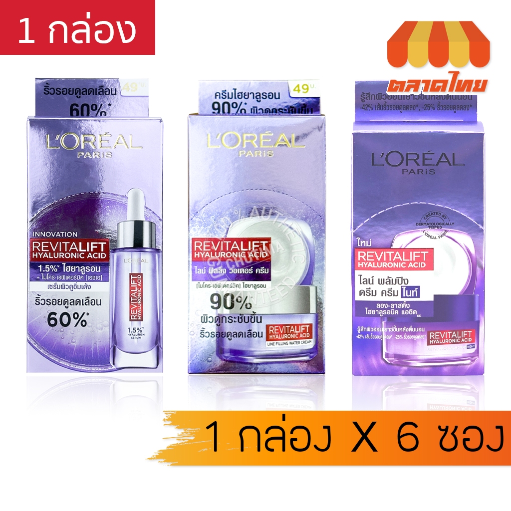 (ยกกล่อง 6 ซอง) ครีมซอง ลอรีอัล ปารีส รีไวทัลลิฟท์ L'OREAL PARIS REVITALIFT HYALURONIC ACID HYALURON SERUM/ CREAM x6