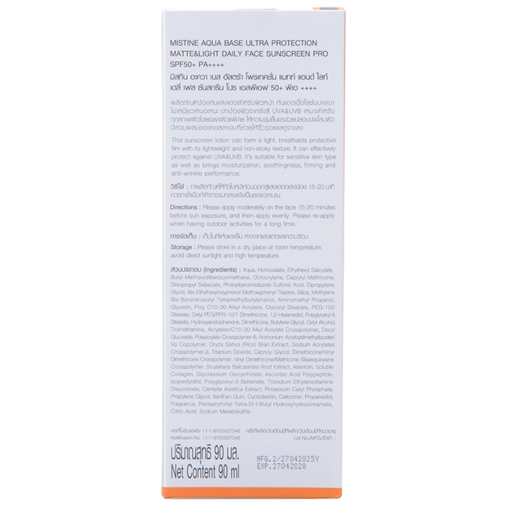 MISTINE - Aqua Base Ultra Protection Matte&Light Daily Face Sunscreen Pro SPF50+ PA++++ (90ml) มิสทิน กันแดด