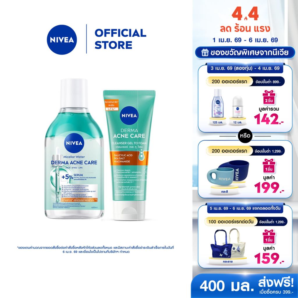 นีเวีย ไมเซล่า วอเตอร์ เดอร์มา แอคเน่ แคร์ 400 มล. และนีเวีย เดอร์มา แอคเน่ แคร์ เคลนเซอร์เจลทูโฟม 90 มลNIVEA