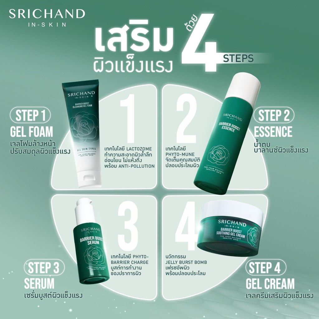 (รวม) Srichand ศรีจันทร์ แบริเออร์ บูส เจลโฟม / น้ำตบ / เซรั่ม / เจลครีม สร้างเกราะป้องกัน X เสริมผิวแข็งแรง ใน 24 ชม.*