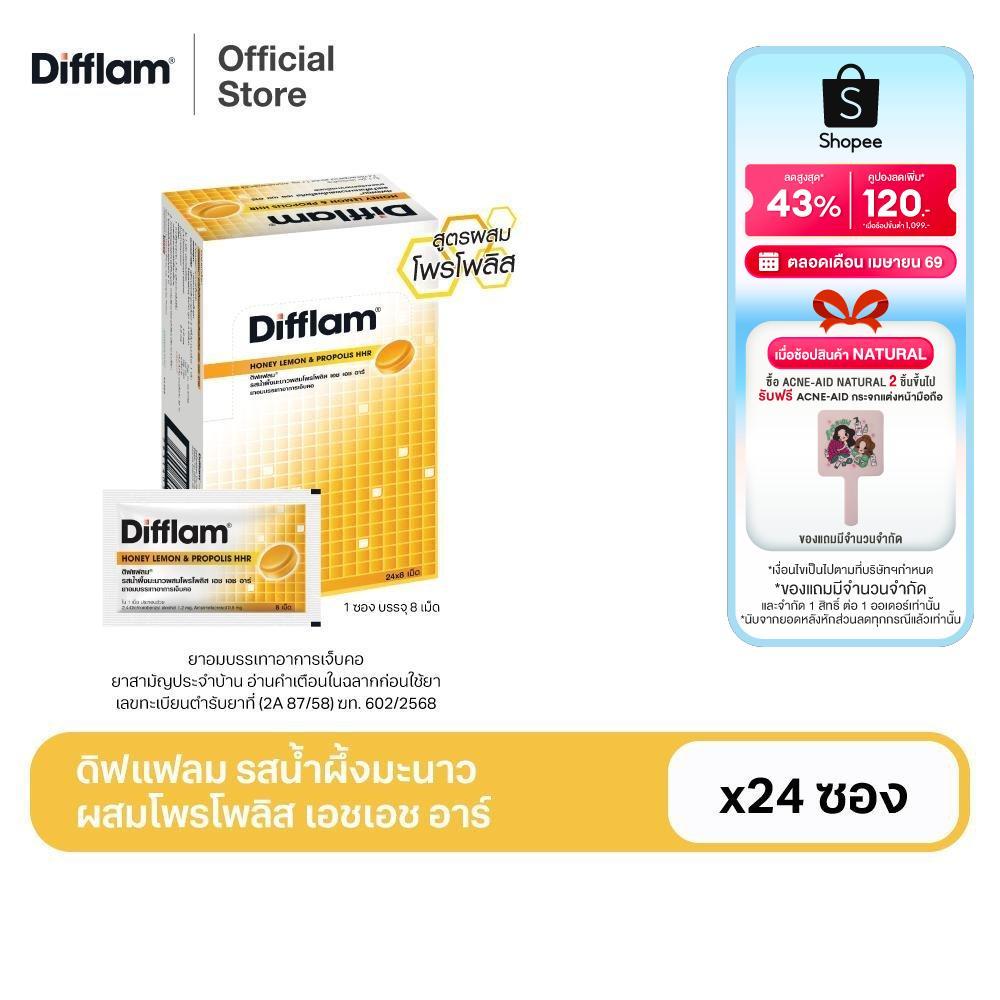 DIFFLAM HONEY & LEMON HHR ดิฟแฟลม รสน้ำผึ้งมะนาวผสมโพรโพลิส เอช เอช อาร์ 1 กล่อง (24 ซอง)