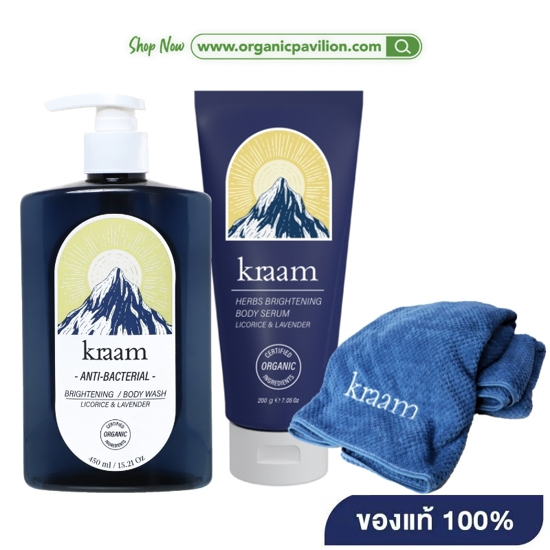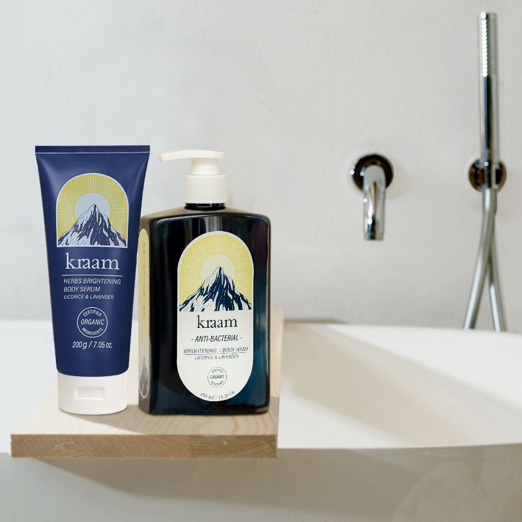 KRAAM Anti-Bacterial Brightening Body Wash 450 ml + Body Serum 200 g (Licorice & Lavender) + Body Care Towel