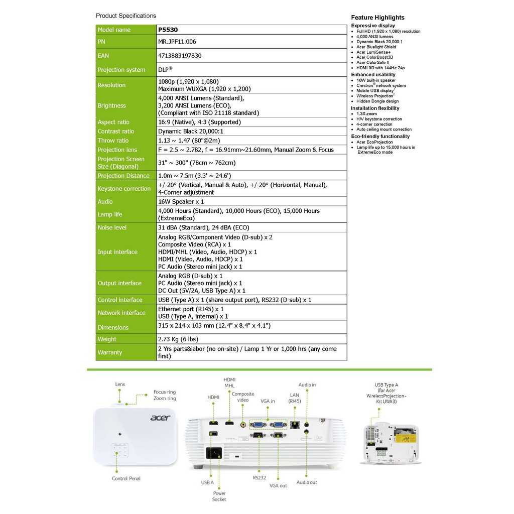 ACER Projector รุ่น P5530 (DLP / 4,000 lm / 1080P) ประกันศูนย์ Acer Thailand 3 ปี