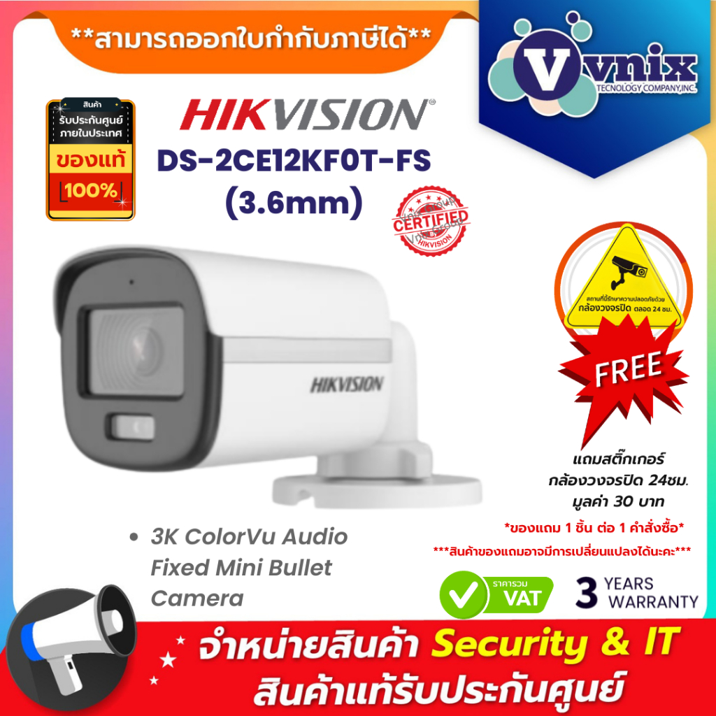 DS-2CE12KF0T-FS(3.6mm) กล้องวงจรปิด Hikvision 3K ColorVu Audio Fixed Mini Bullet Camera By Vnix Group